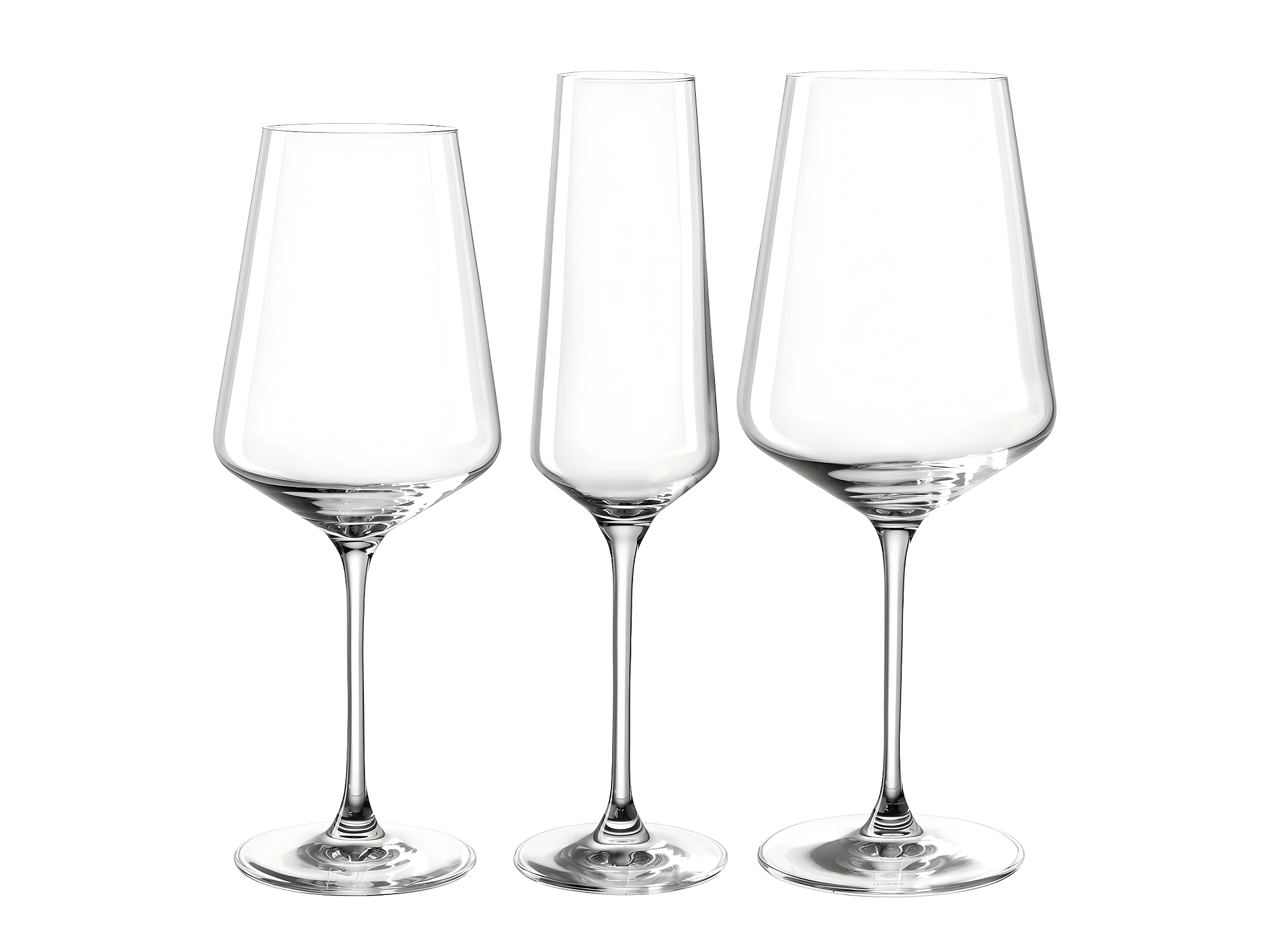 Lote de 12 vasos de vino y champán de vidrio transparente.
