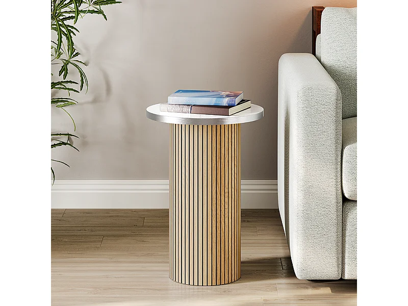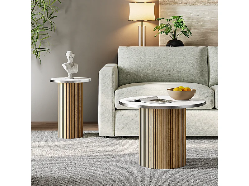 Lote de 2 Mesas bajas redondas - base de columna romana - chapa de mármol - Natural claro