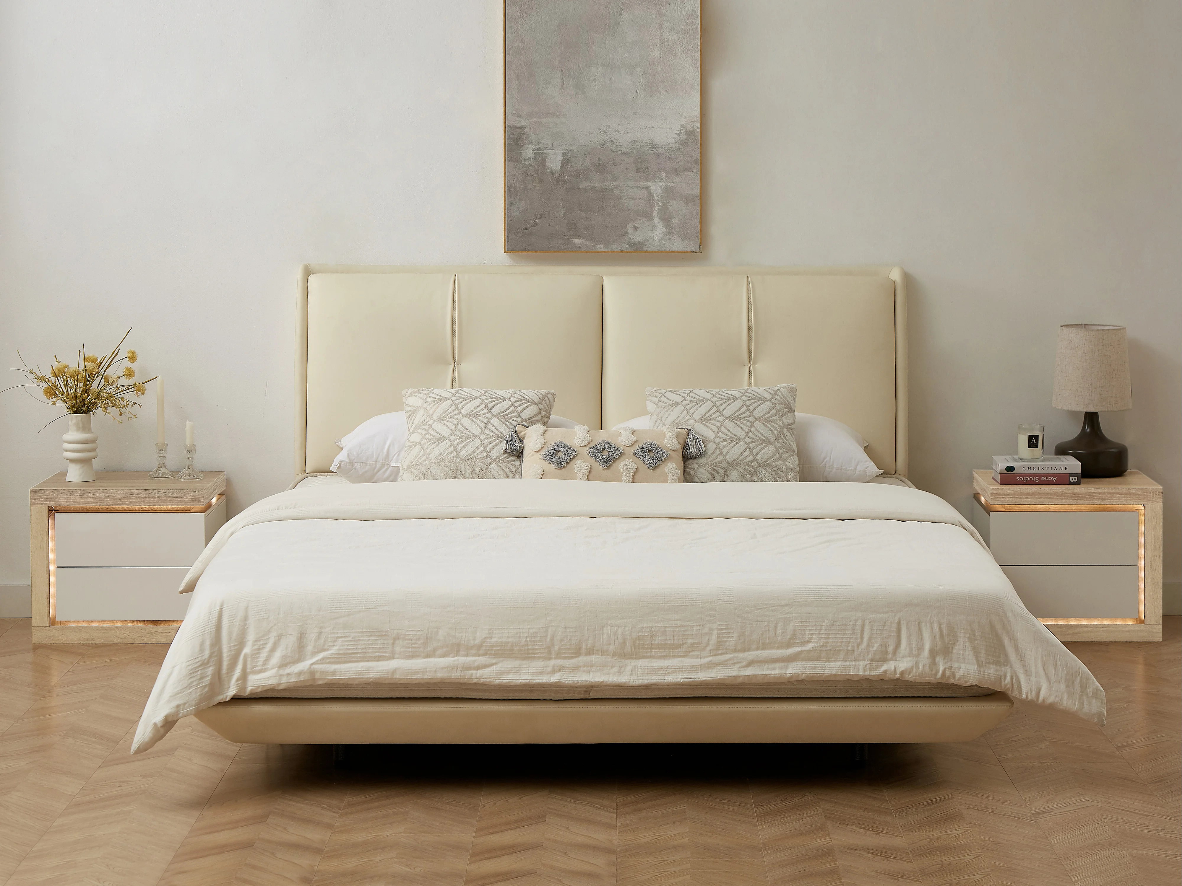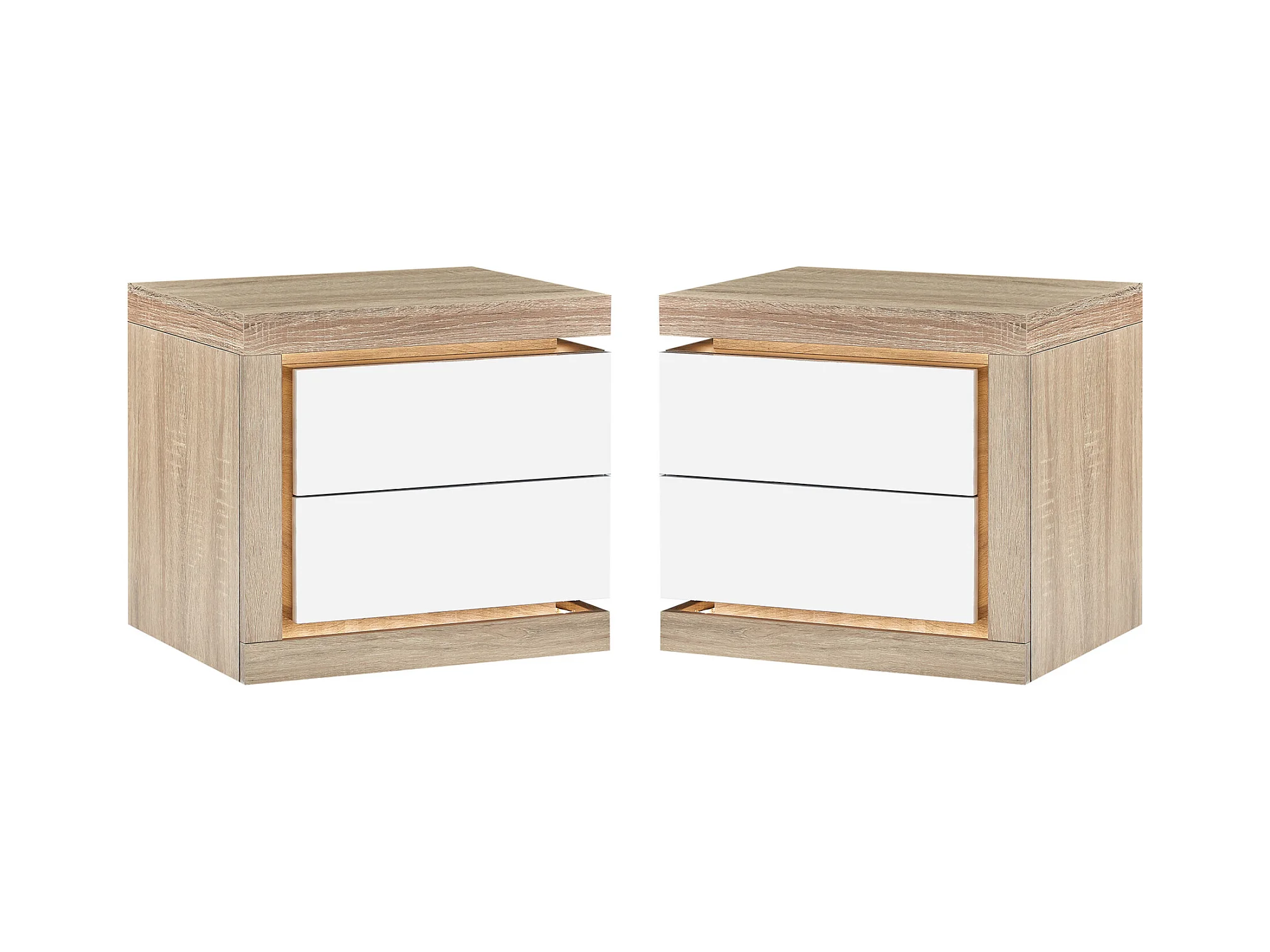 Lote de 2 mesitas de noche con 2 cajones - Con LED - Blanco lacado y natural - FLARANCIA