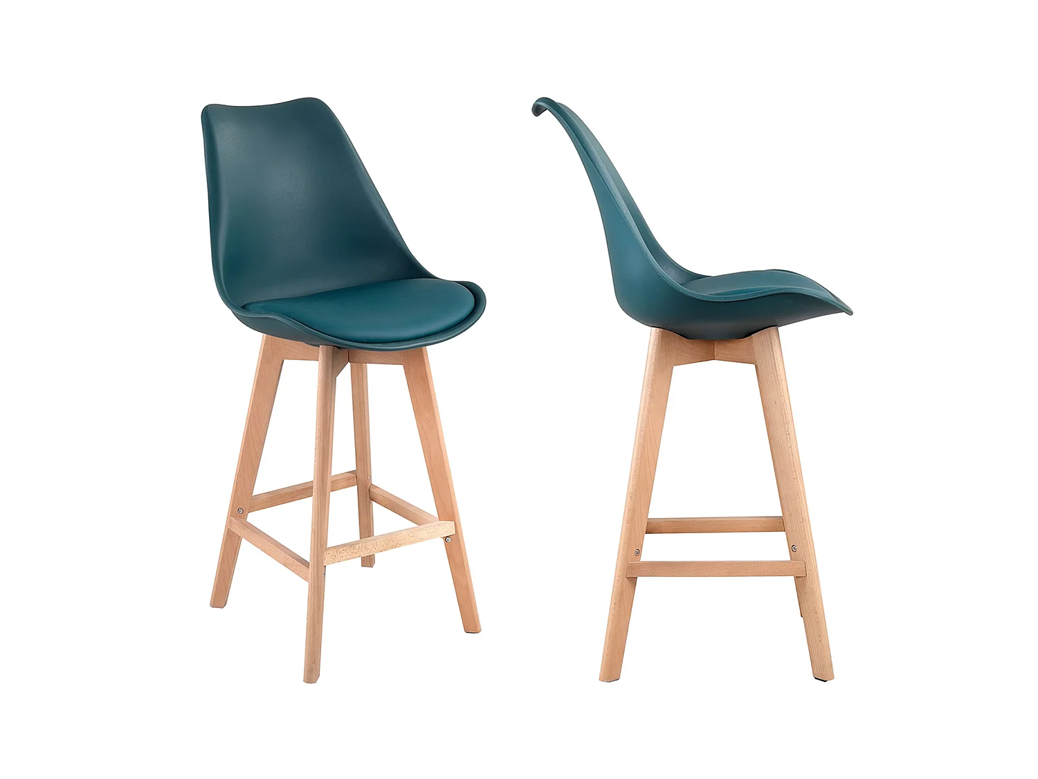 Taburete nórdico con cojín polipiel azul pato y patas de haya clara Tula 67 cm
