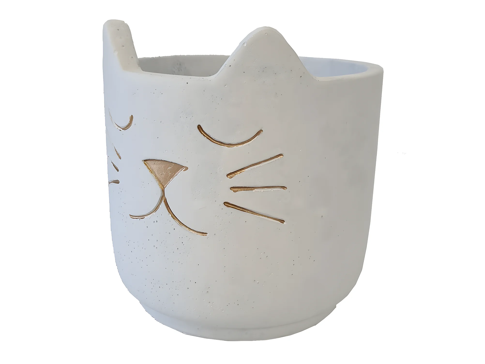 Macetero de cemento blanco con cabeza de gato dorado de 19 cm de altura