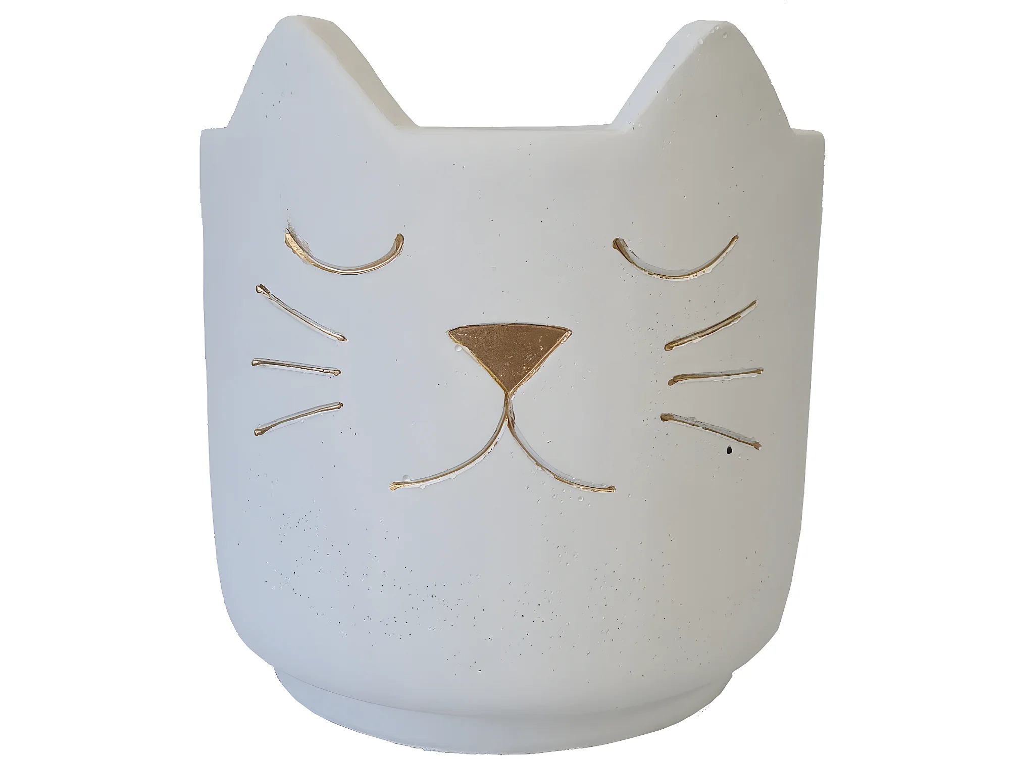 Macetero de cemento blanco con cabeza de gato dorado de 19 cm de altura