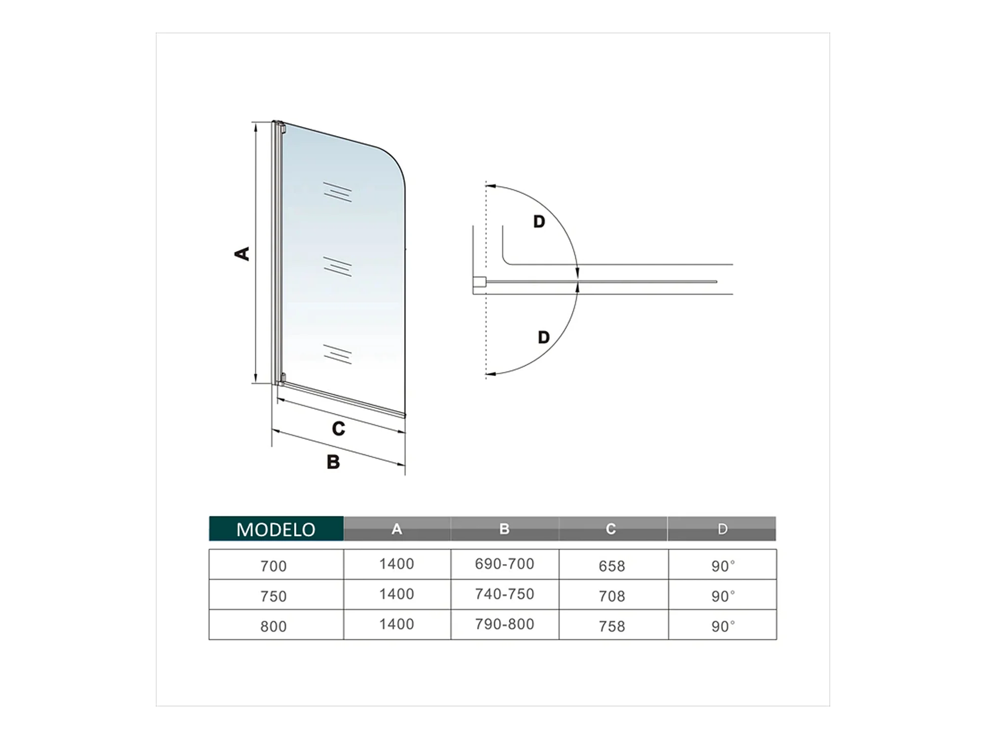 Mampara de Bañera borde de serigrafía negra Cristal Templado 4mm Tamaño:(780-800)x1400mm-AICA