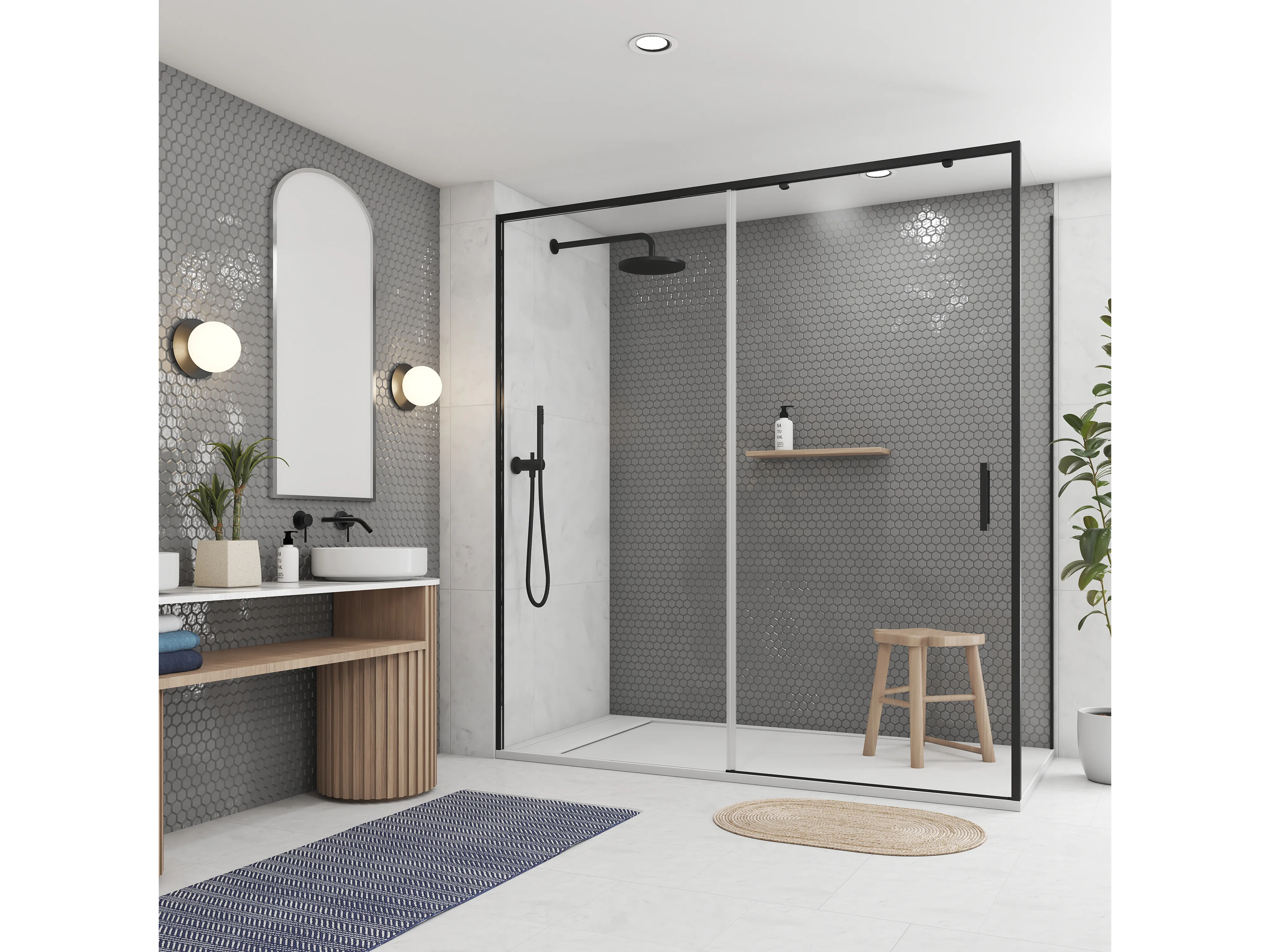 Mampara de Ducha Corredera Angular 1 Puerta + 2 Fijos con Cristal Templado 6 mm Antical Negro Mate 103,5-108 cm (Lado Puerta) + 87,5-90 cm (Fijo Lateral) x 195 cm