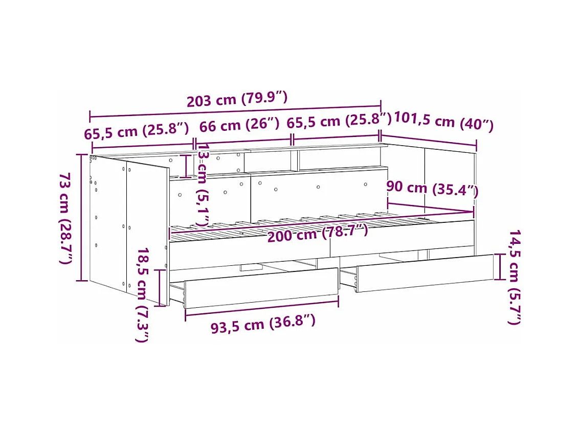 Cama de día con cajones sin colchón roble ahumado 90x200 cm