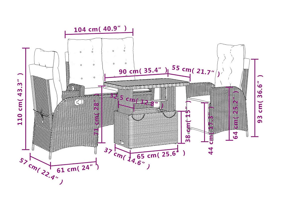 Toby Dean Juego comedor jardín 4 piezas con cojines ratán sintético negro