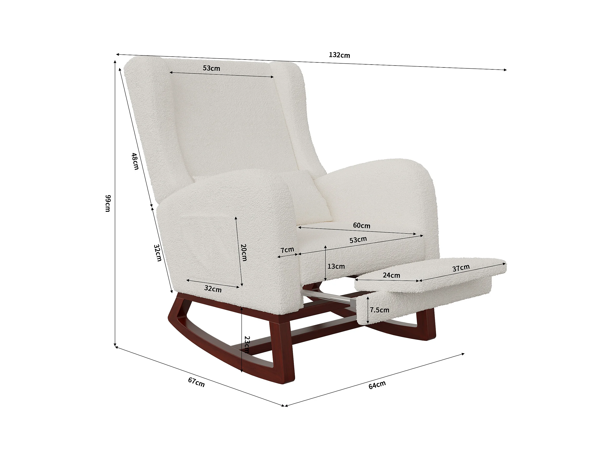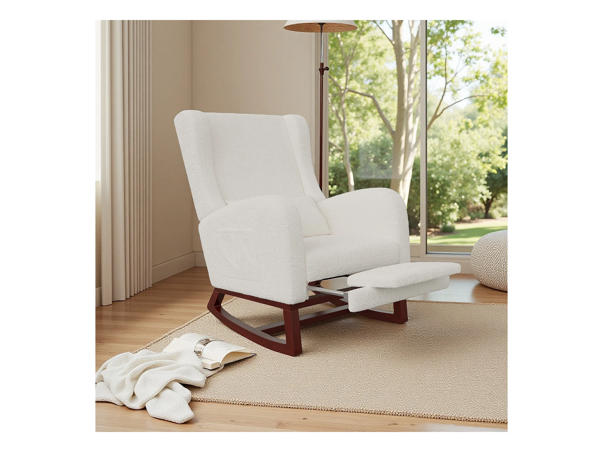 Mecedora de tela de peluche, diseño ergonómico con reposapiés ajustable, estructura de madera, color blanco (122,5 x 70 x 104 cm)