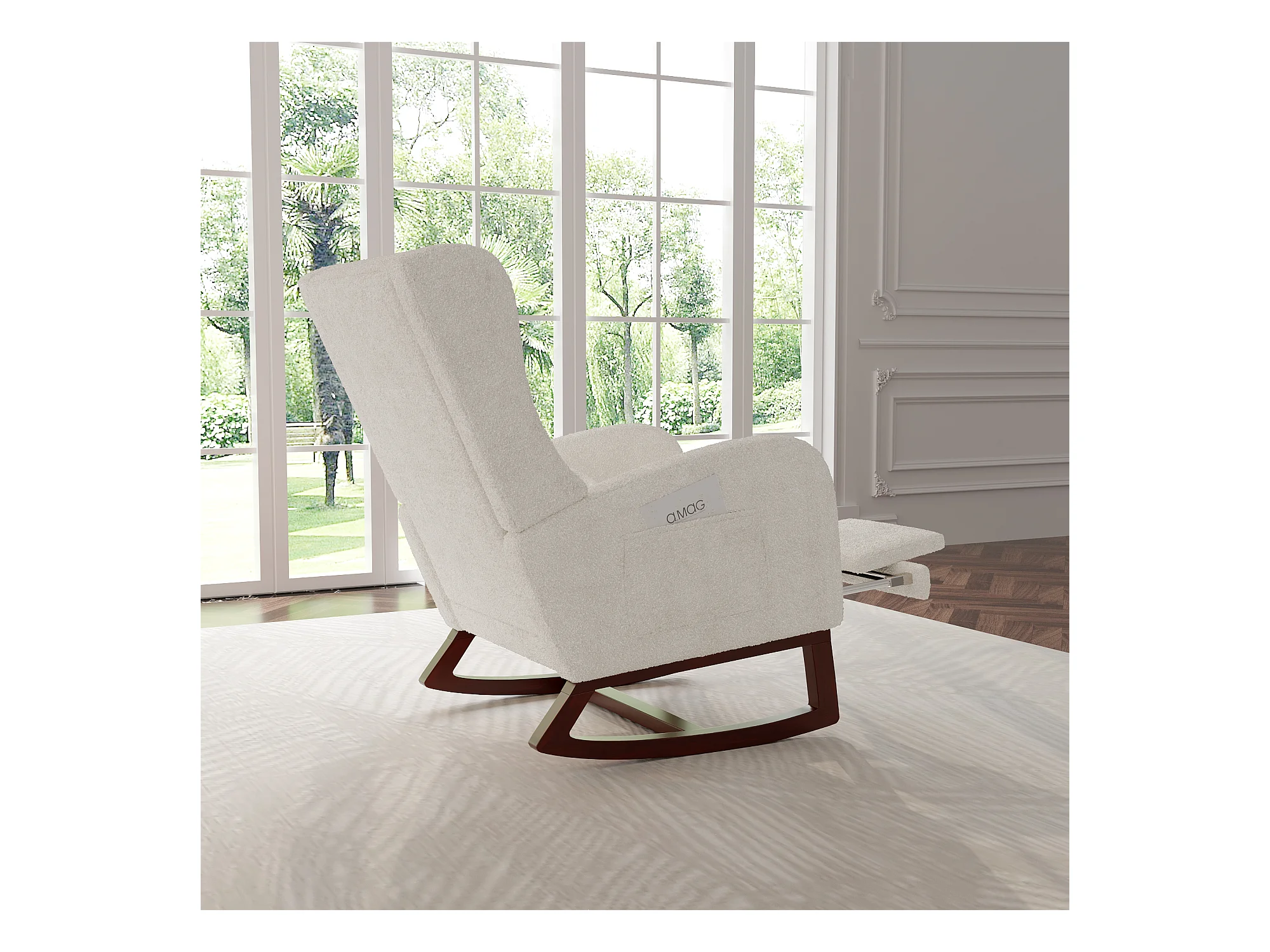 Mecedora de tela de peluche blanca con bolsillos laterales, asiento ancho y deslizadores silenciosos antideslizantes.
