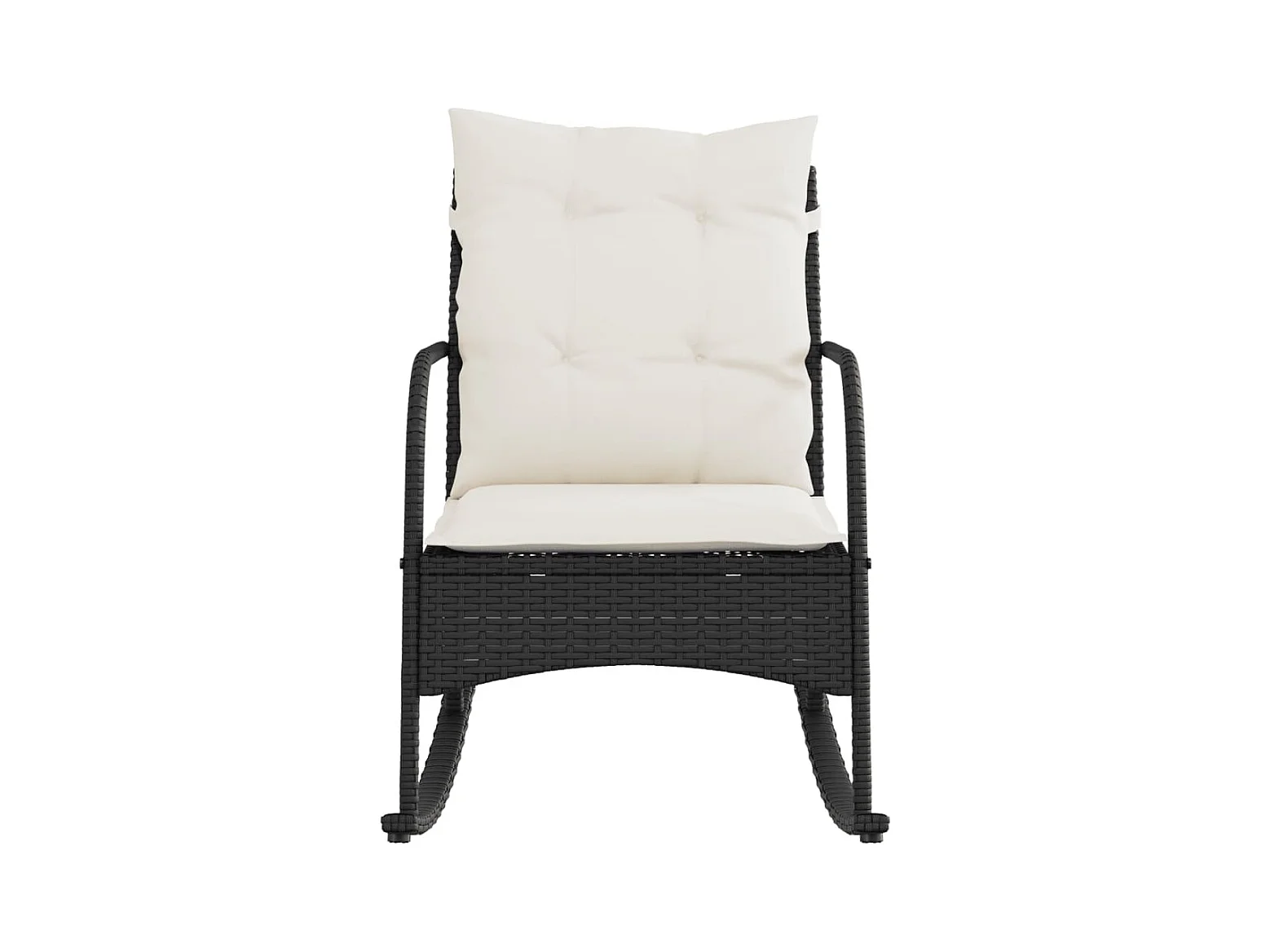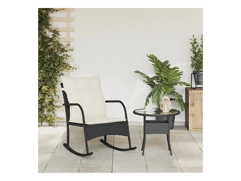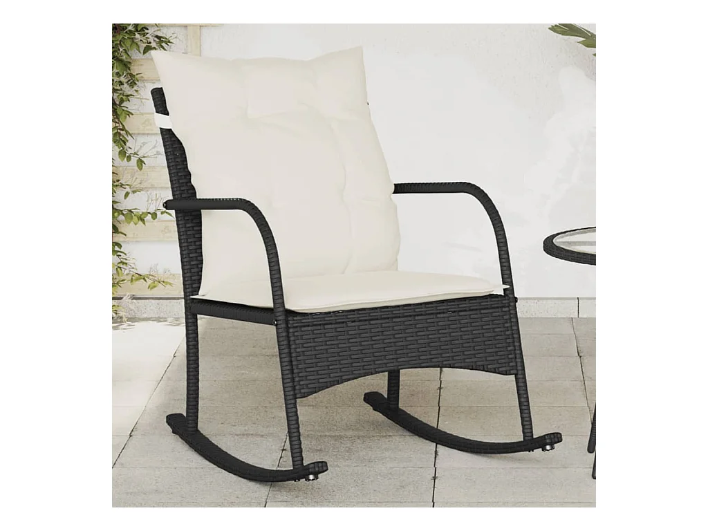 Mecedora de jardín con cojines negros de resina de mimbre.