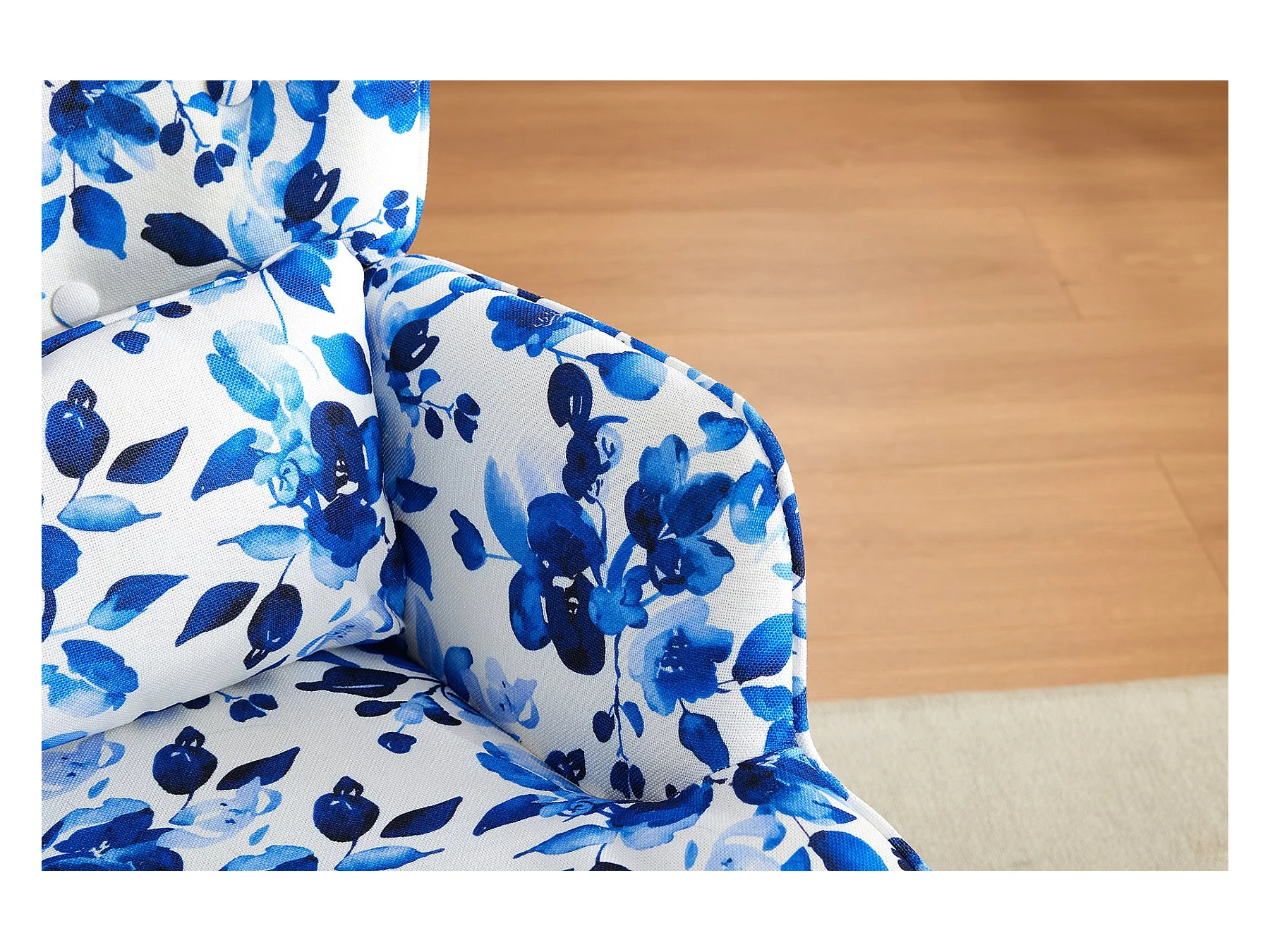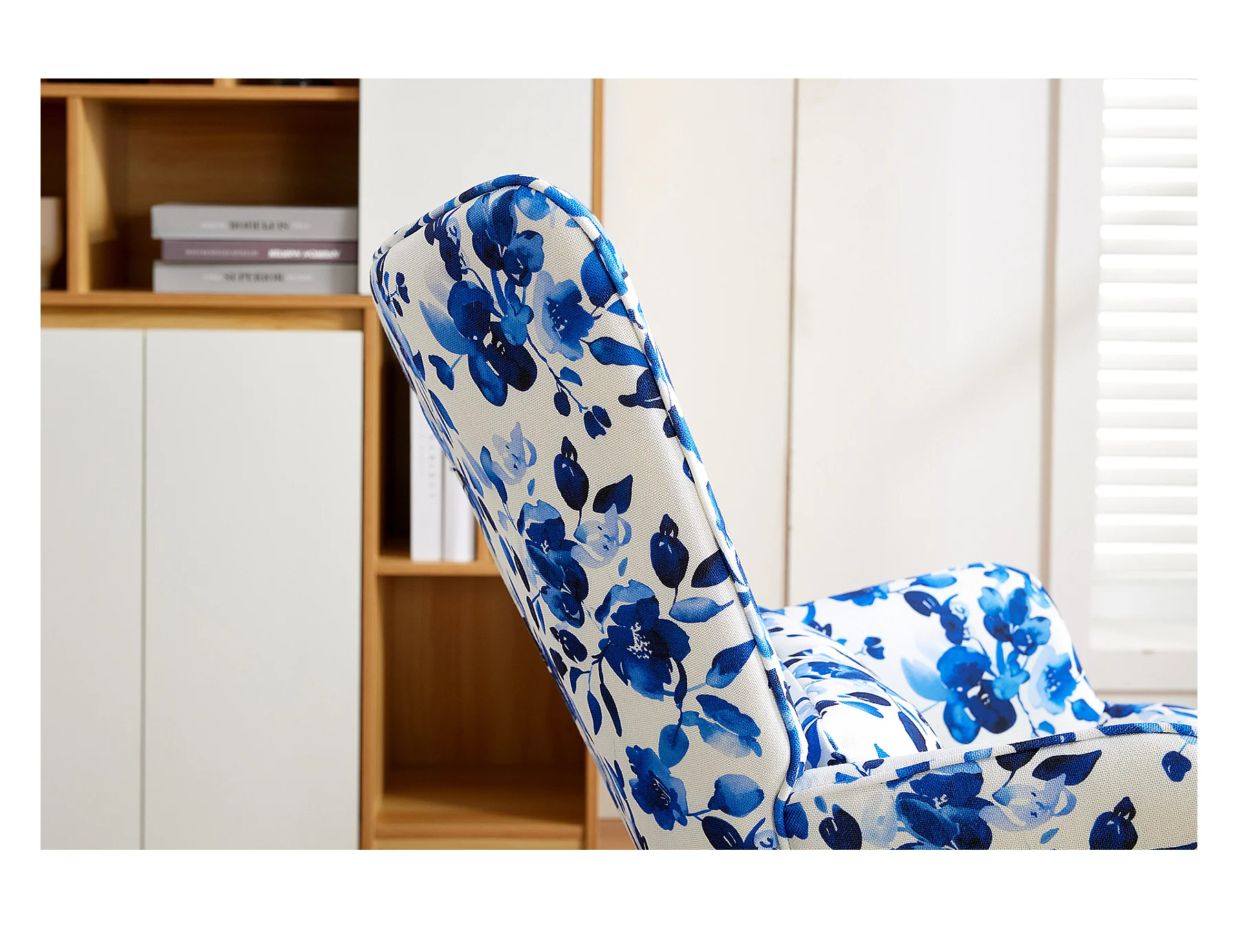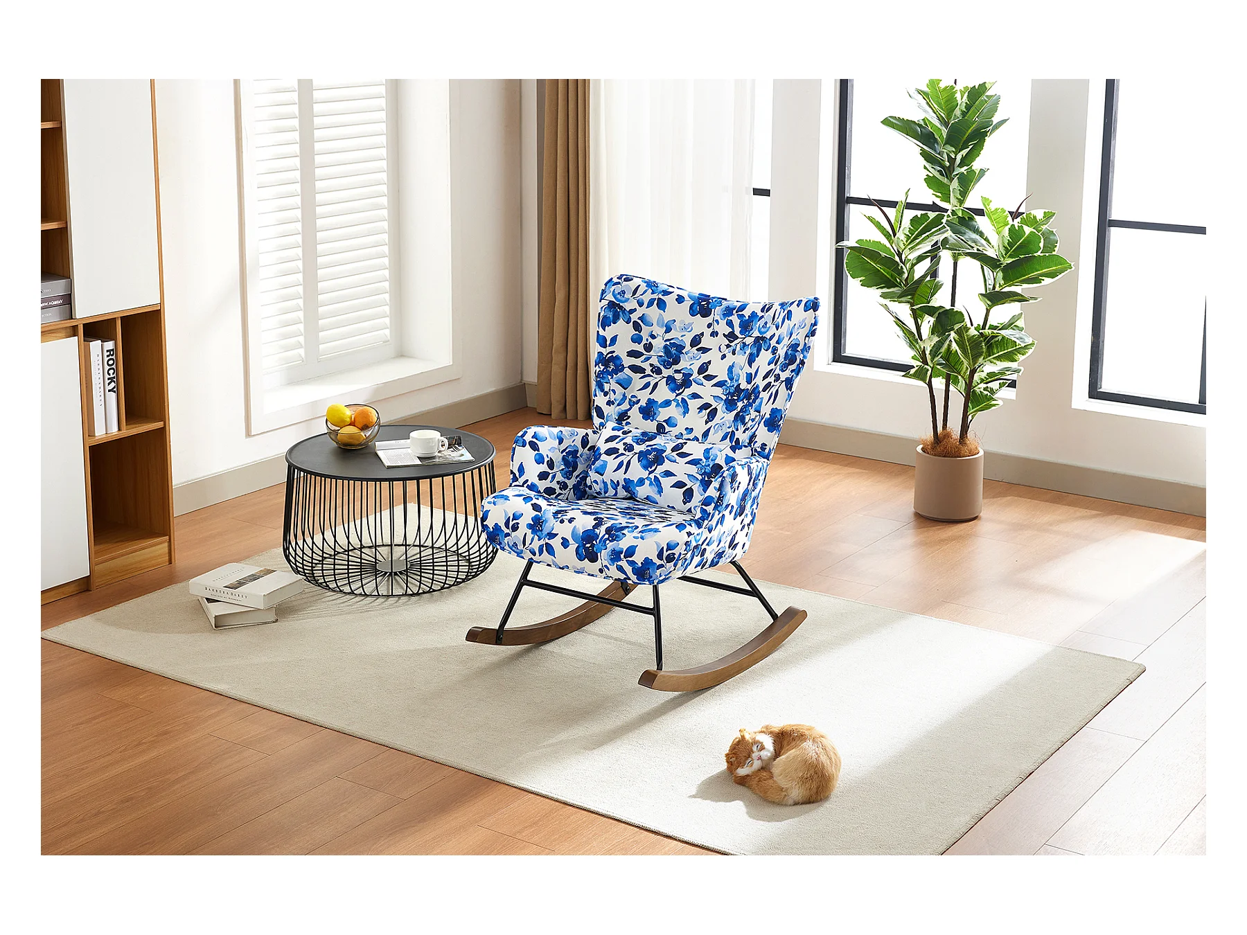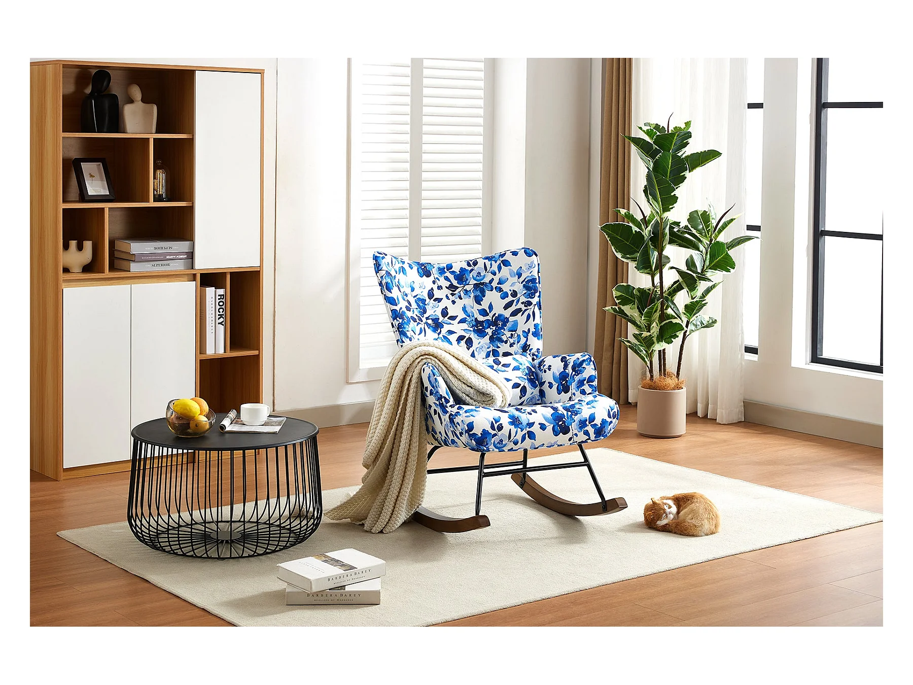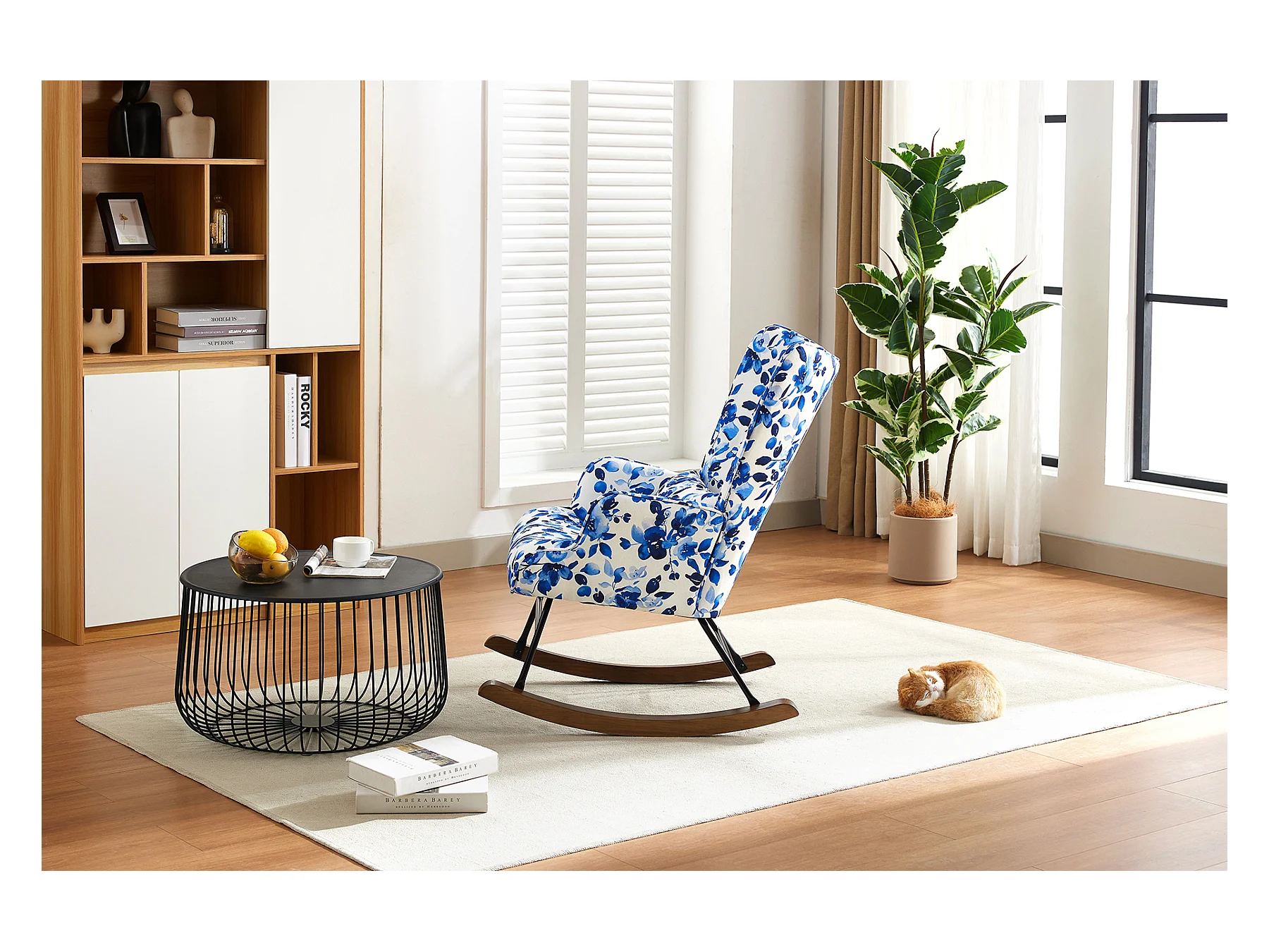 Elegante mecedora de terciopelo con estructura de metal y base de madera para un dormitorio con estilo.