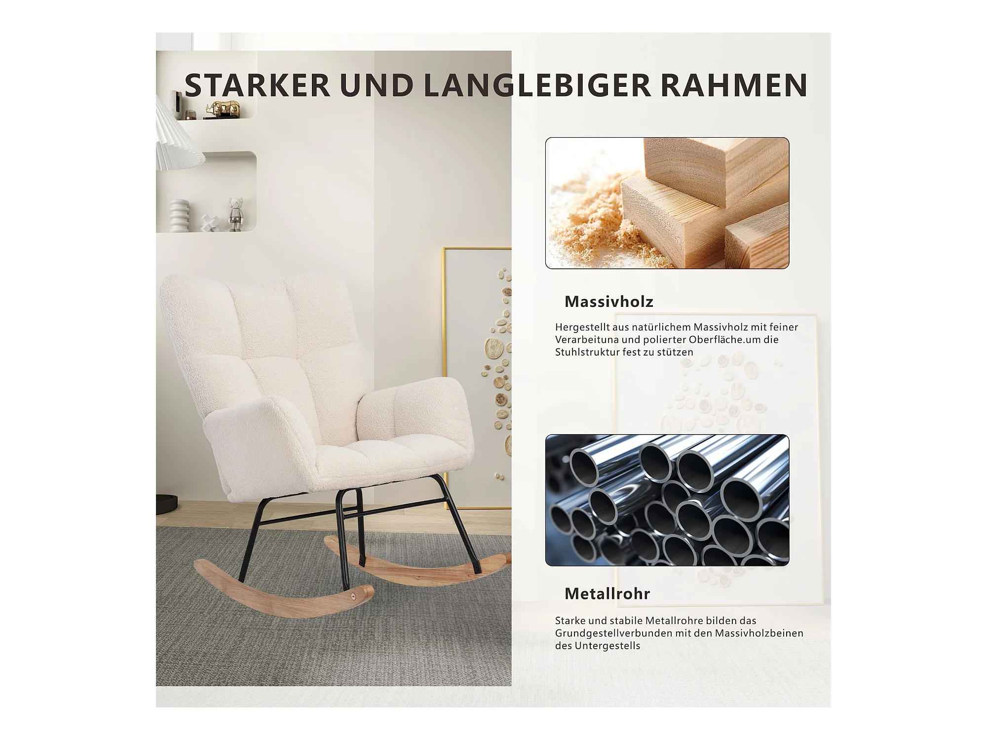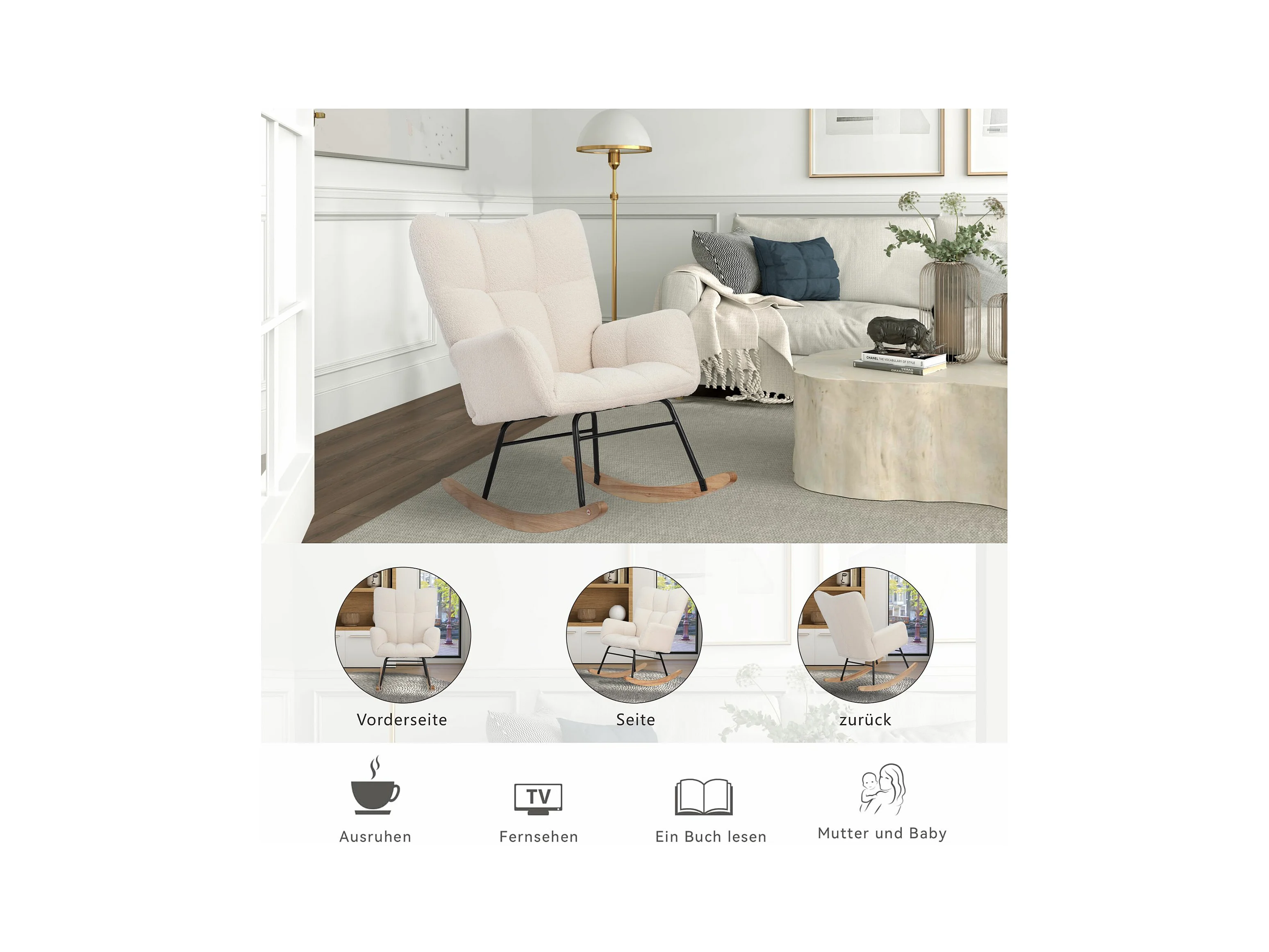 Mecedora con reposabrazos, sillón de lactancia con aspecto de lana, blanco