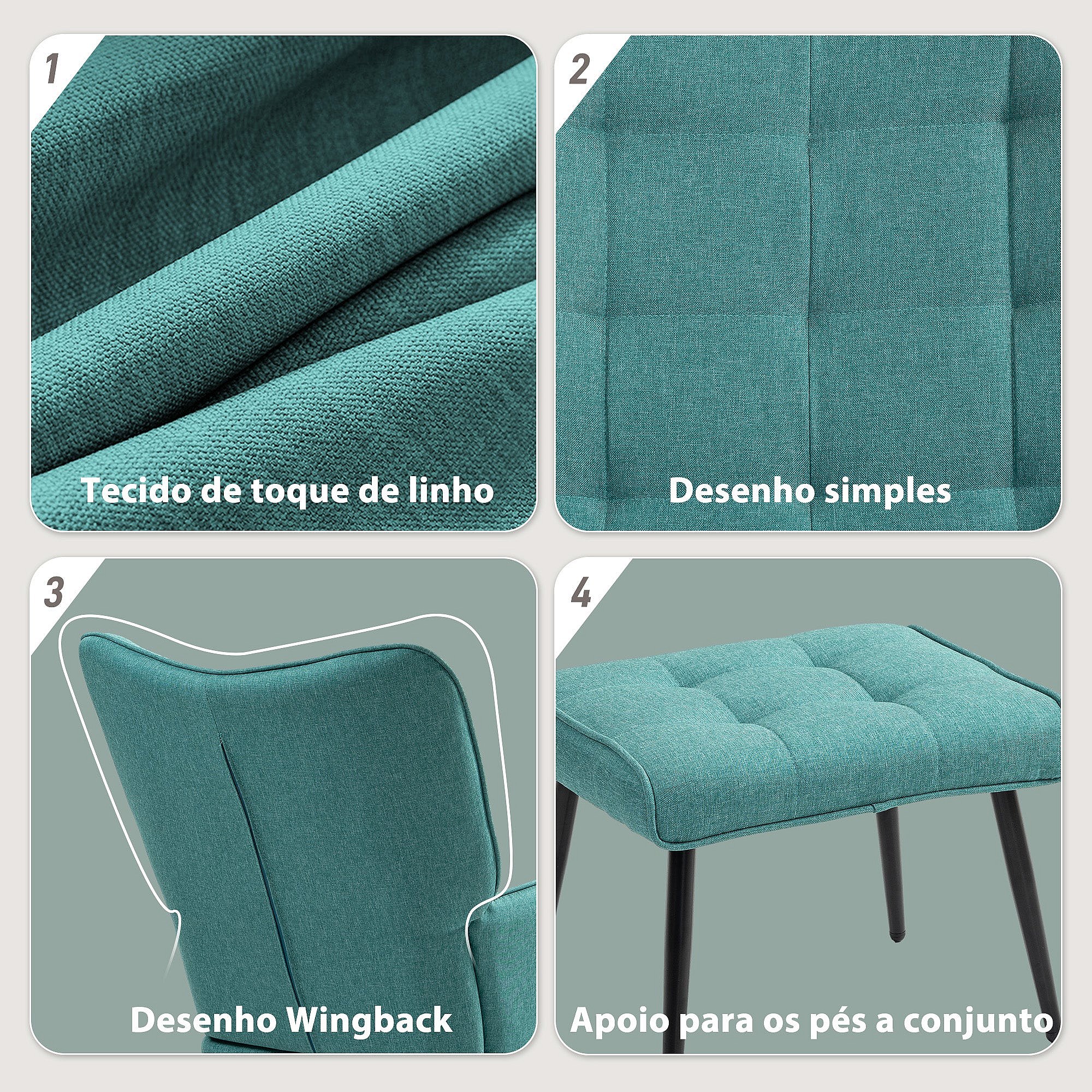 Mecedora con reposapiés, lino, verde oscuro, madera maciza y metal (64x89x90cm)