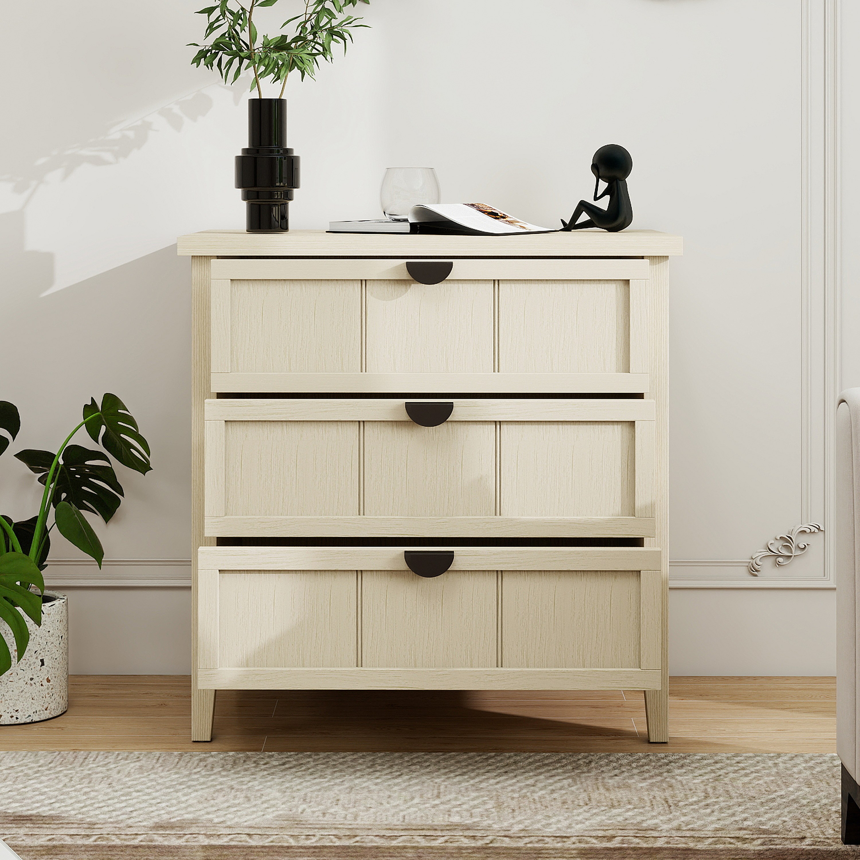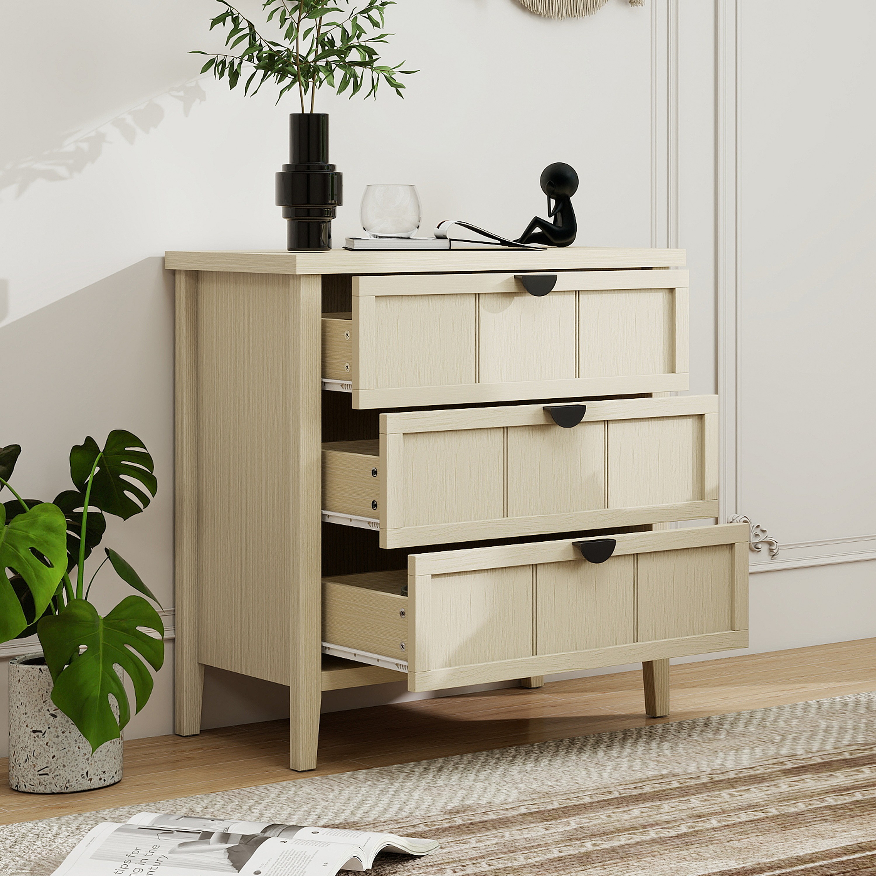 Mueble auxiliar de madera natural, 3 cajones con frentes intercambiables con relieve. Estilo modular, ideal para salón o dormitorio.