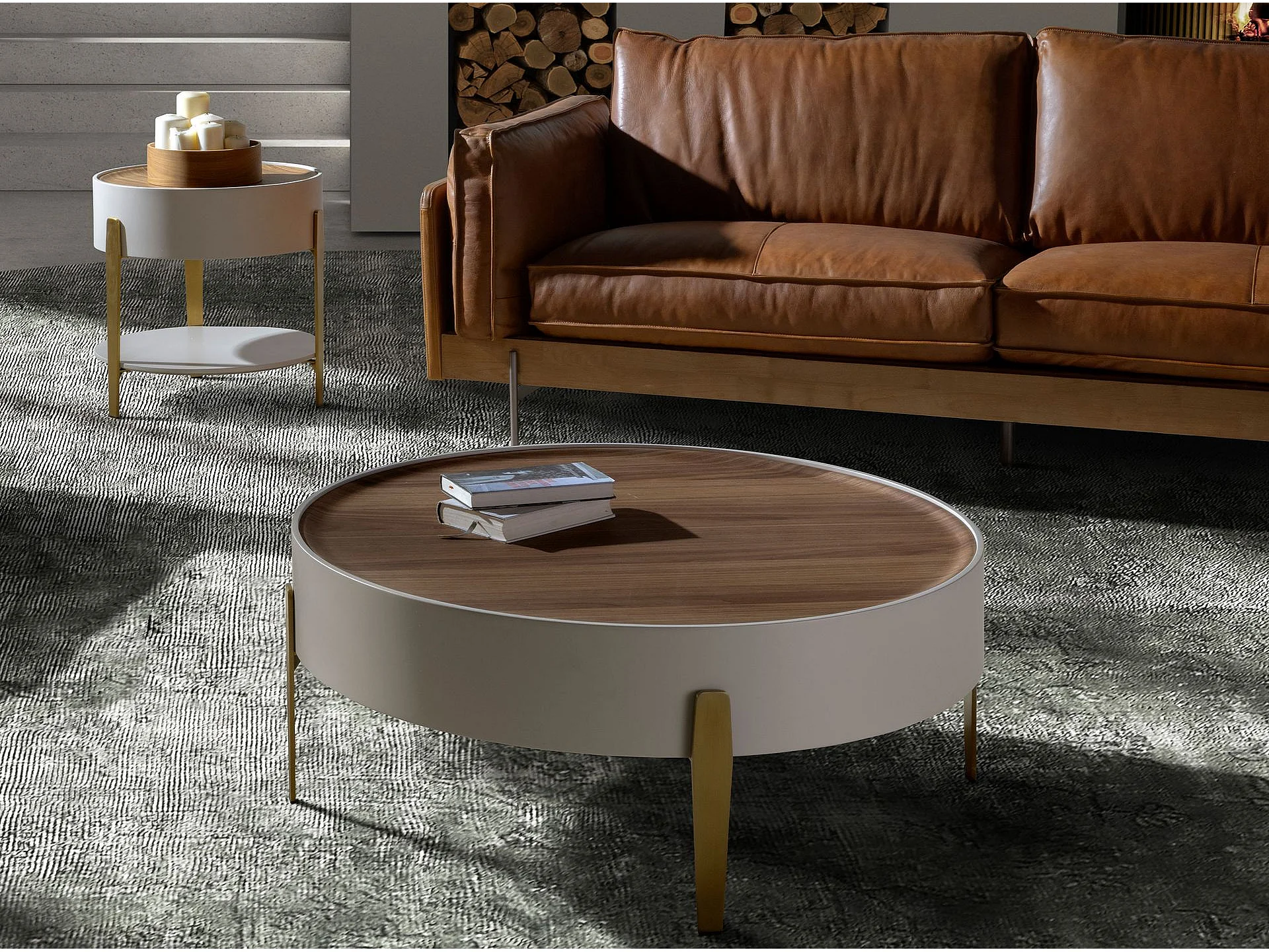 Mesa centro redonda nogal, madera beige y acero pulido dorado 2151 ANGEL CERDA