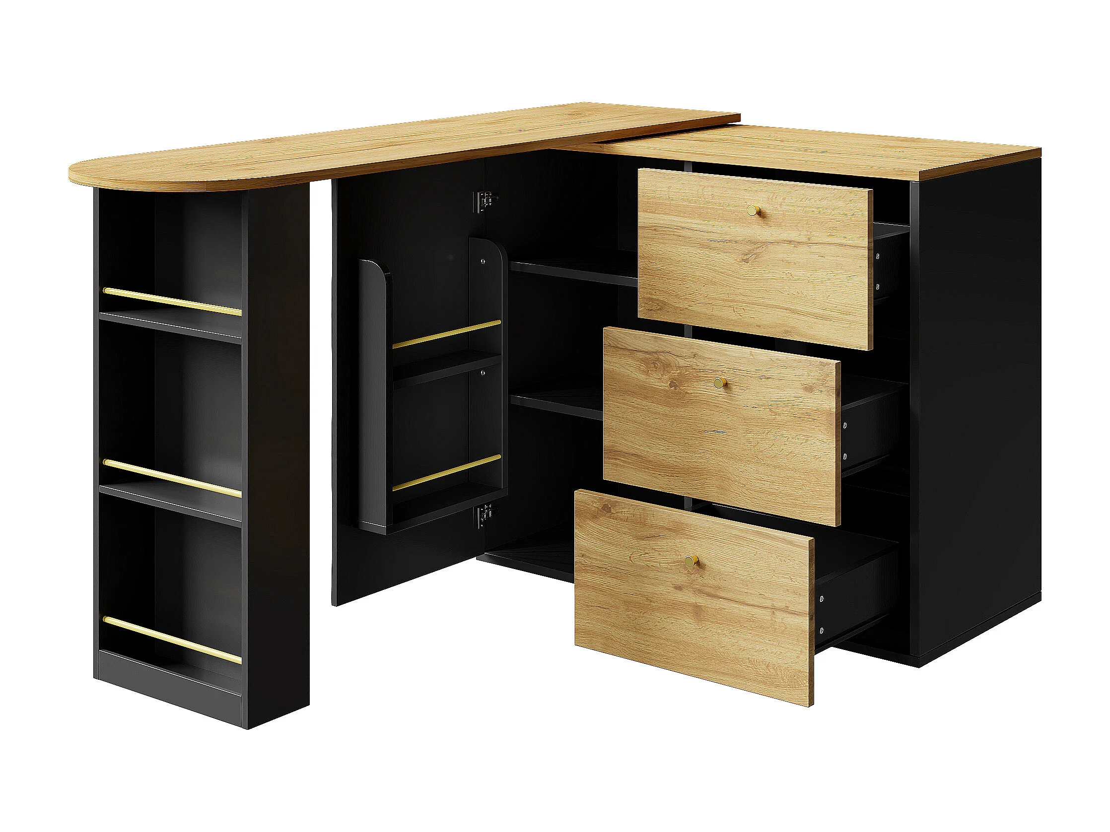 Mesa de bar extensible con espacio de almacenamiento, giratoria 360°, MDF, negra (138-204x39x104 cm)