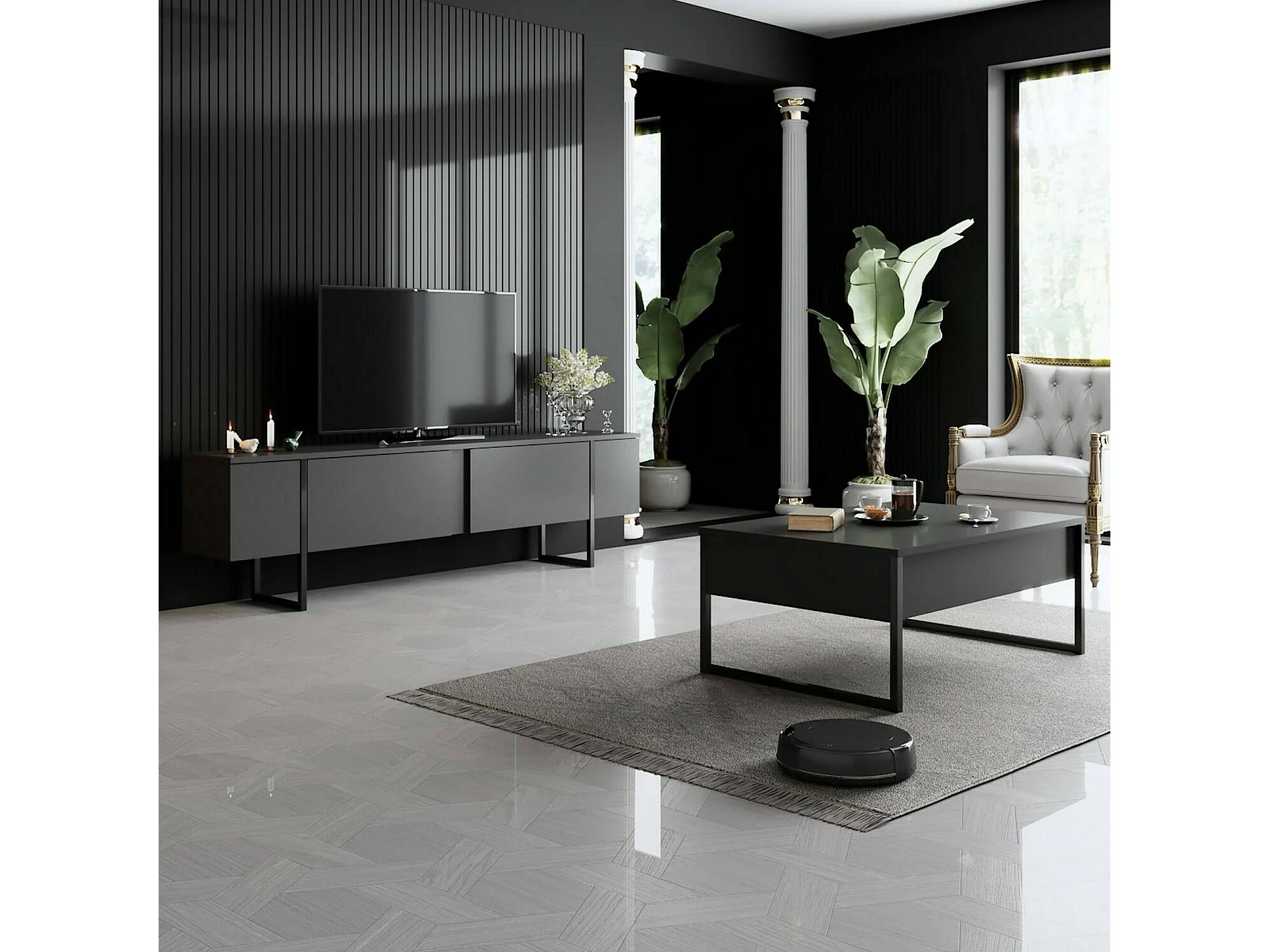 Mesa de café Dgiagnon, Mesa de centro baja, Revistero para sofá, Estante de la sala de estar, 90x60h40 cm, Antracita y Negro