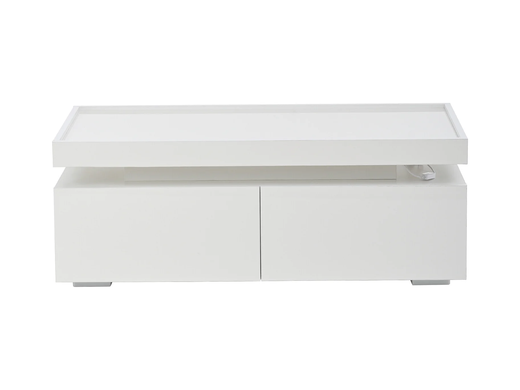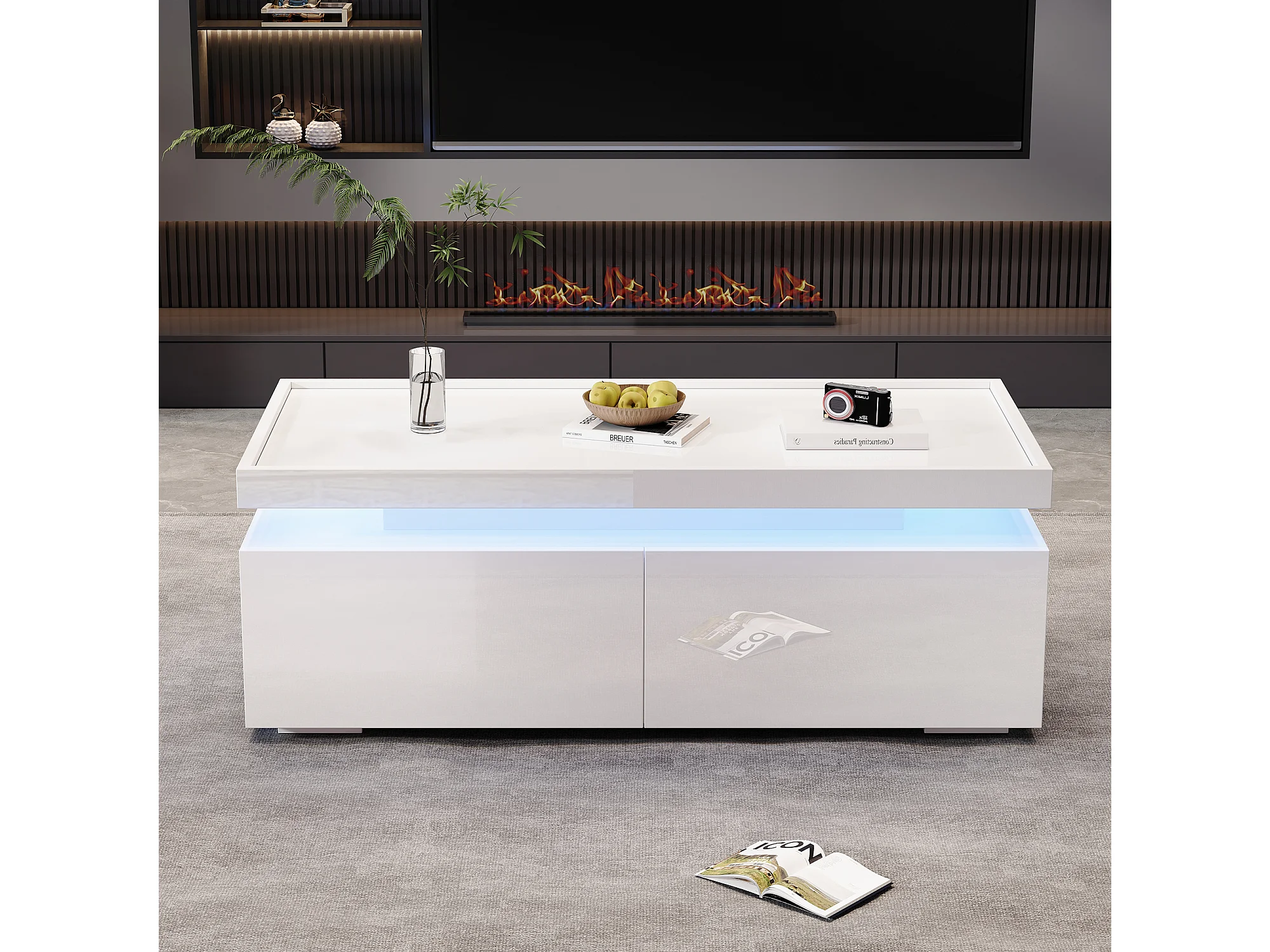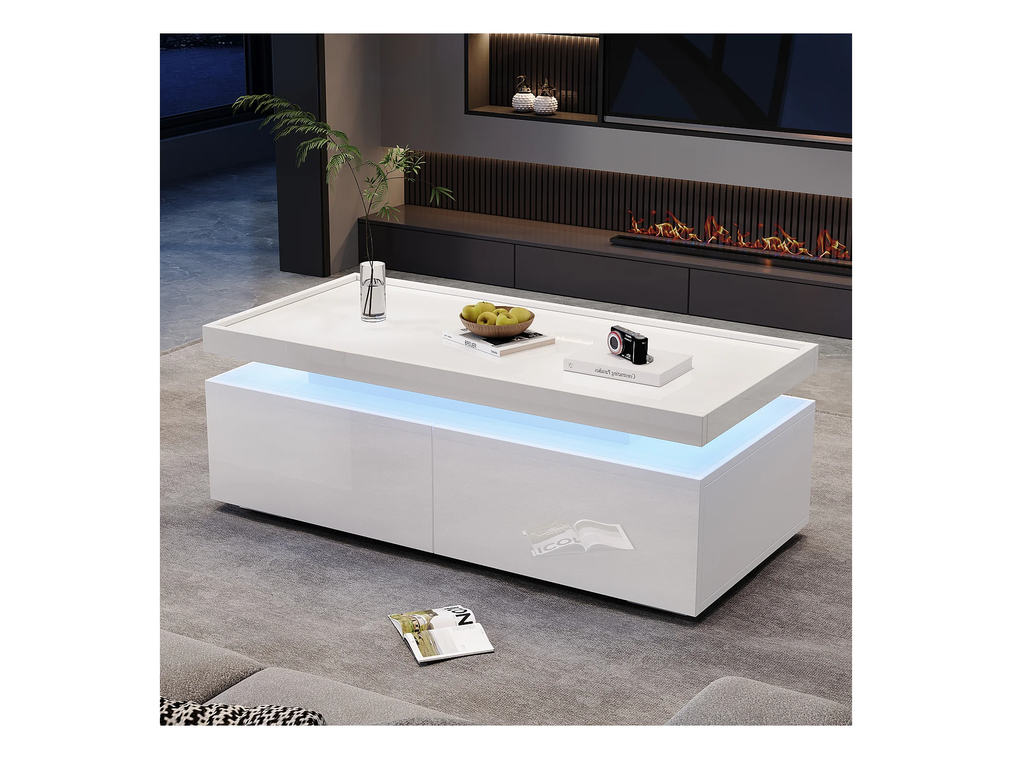 Mesa de centro blanca brillante con luz LED y 2 cajones de almacenamiento – Para salón