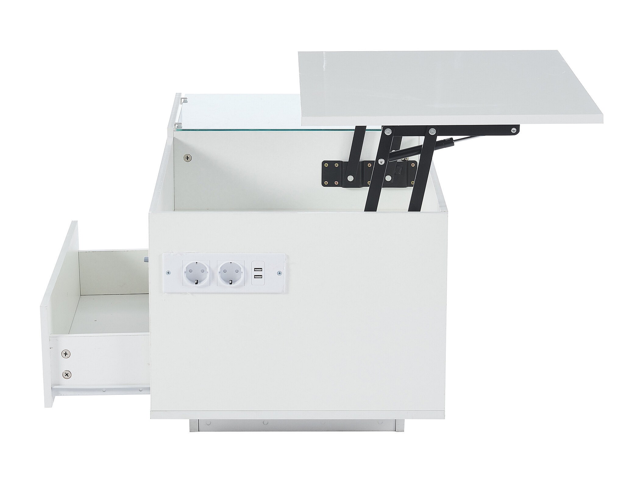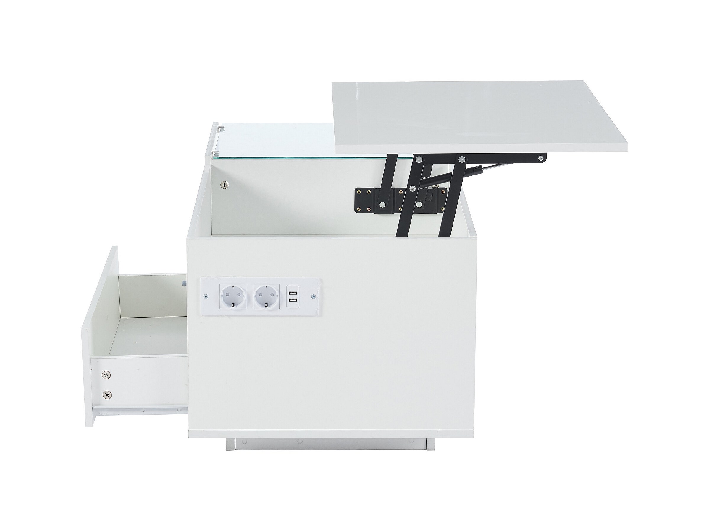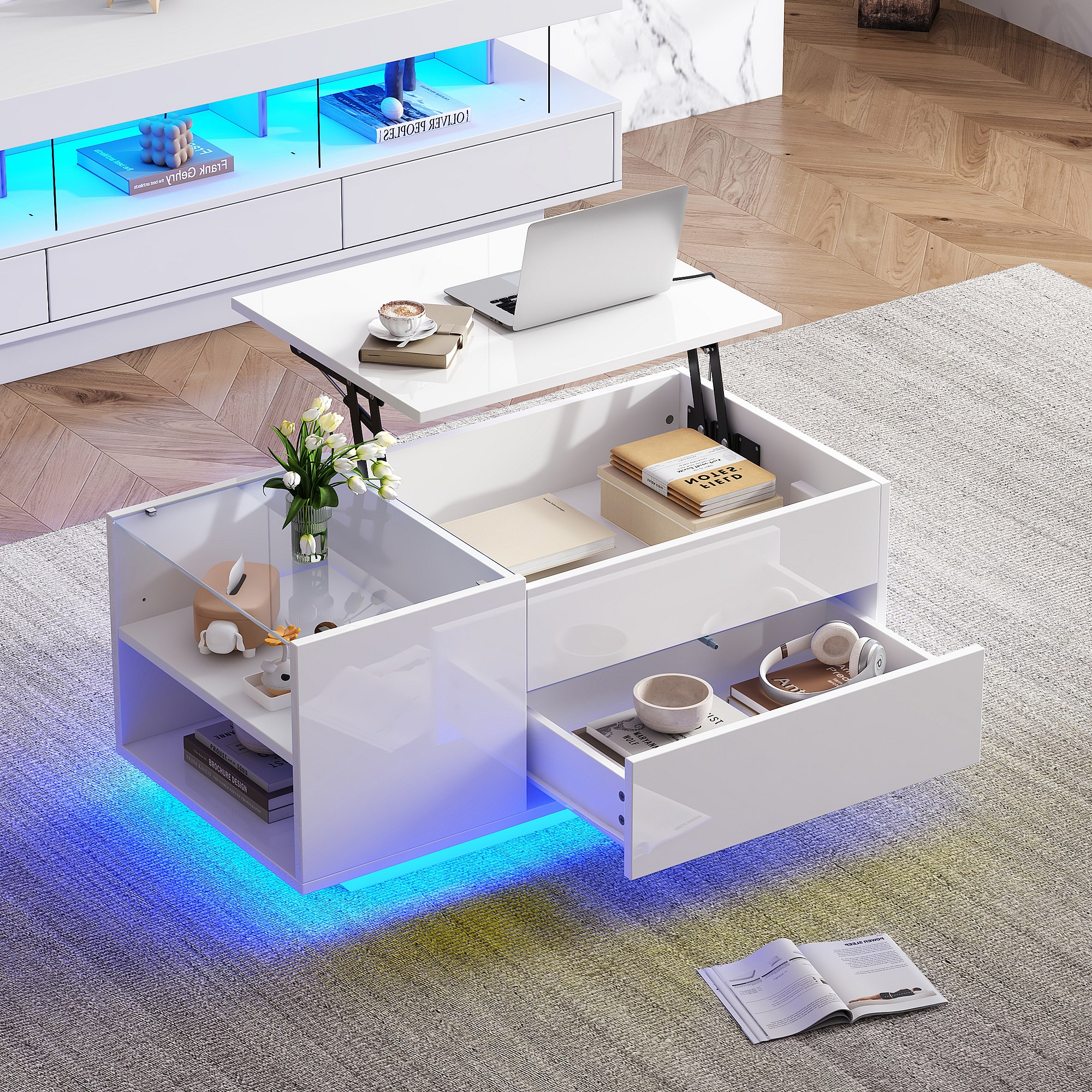 Mesa de centro blanca con tablero regulable en altura – Mesa de centro con iluminación LED y 1 cajón – Almacenaje abierto