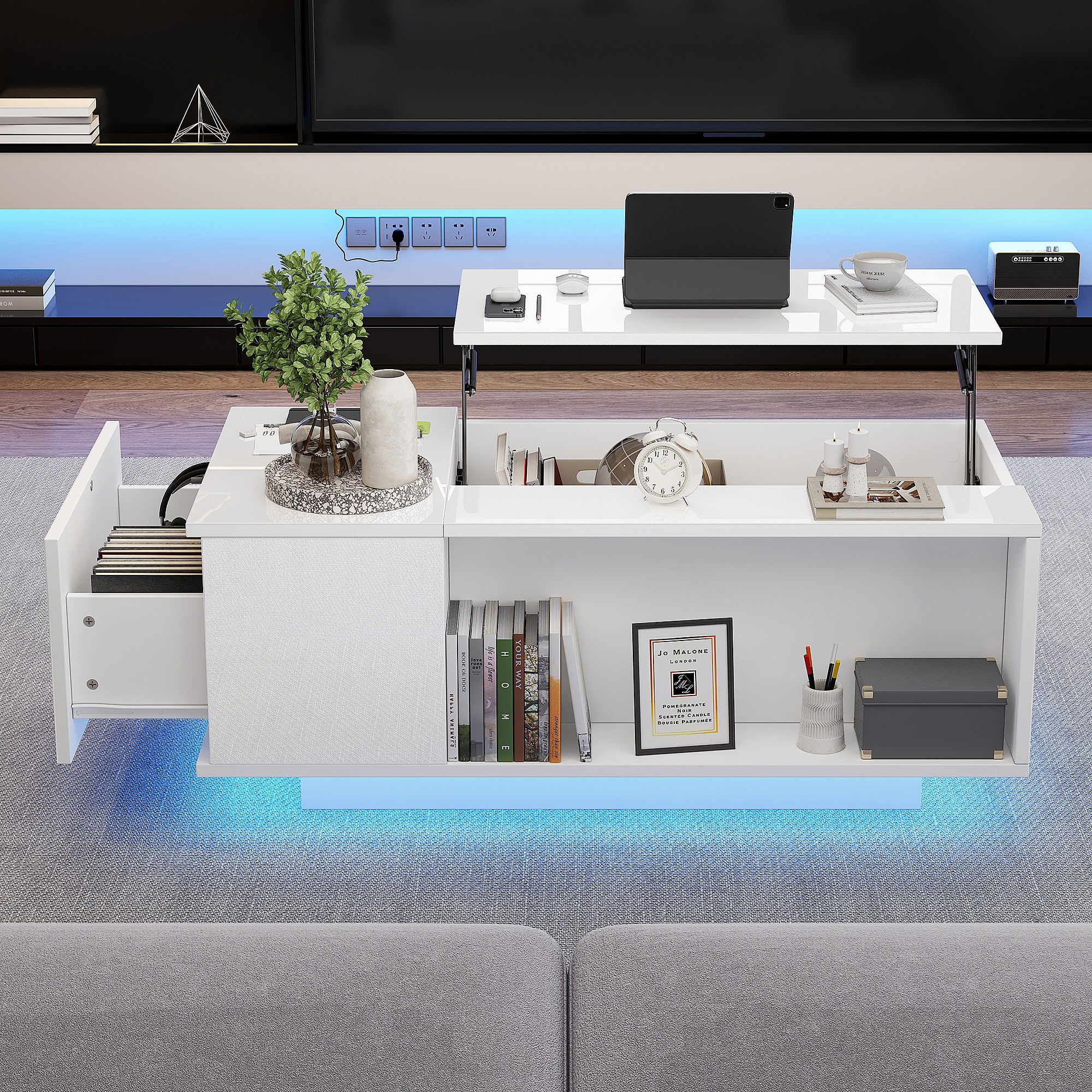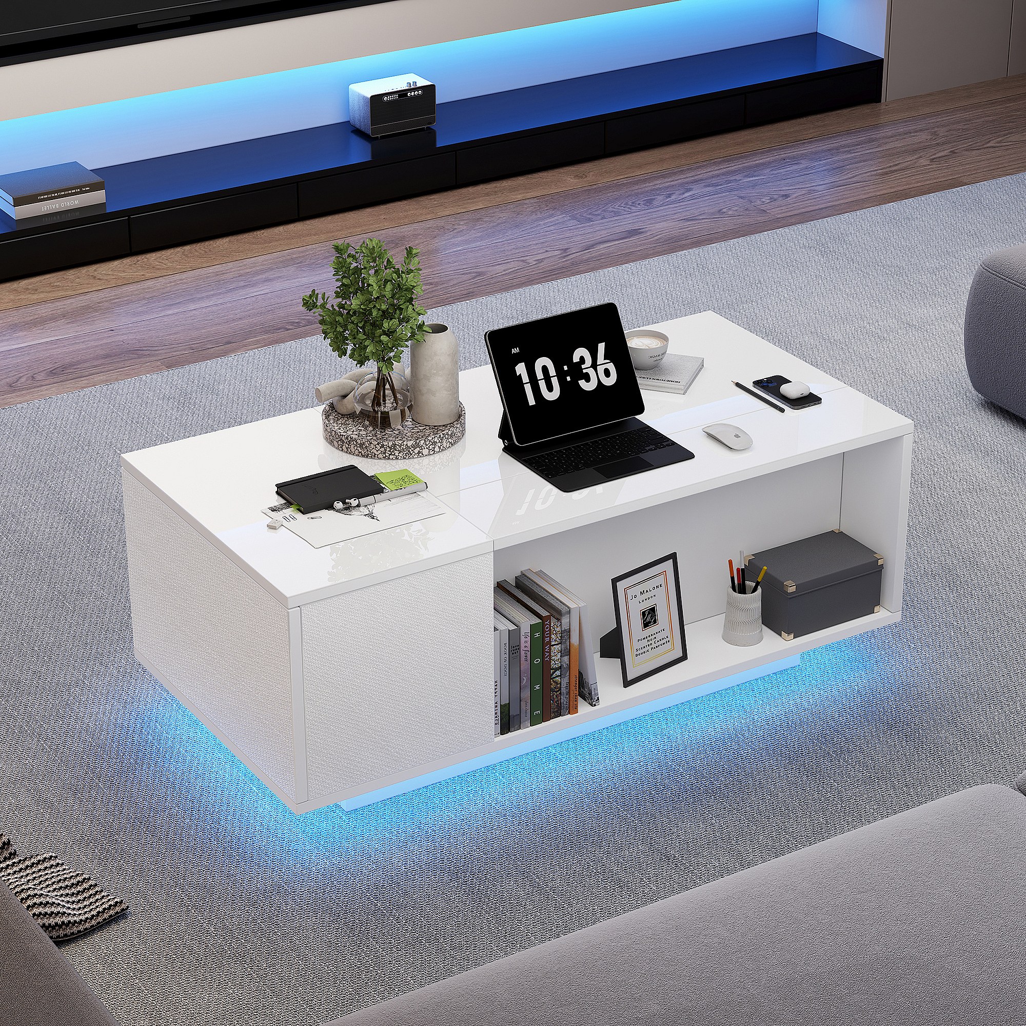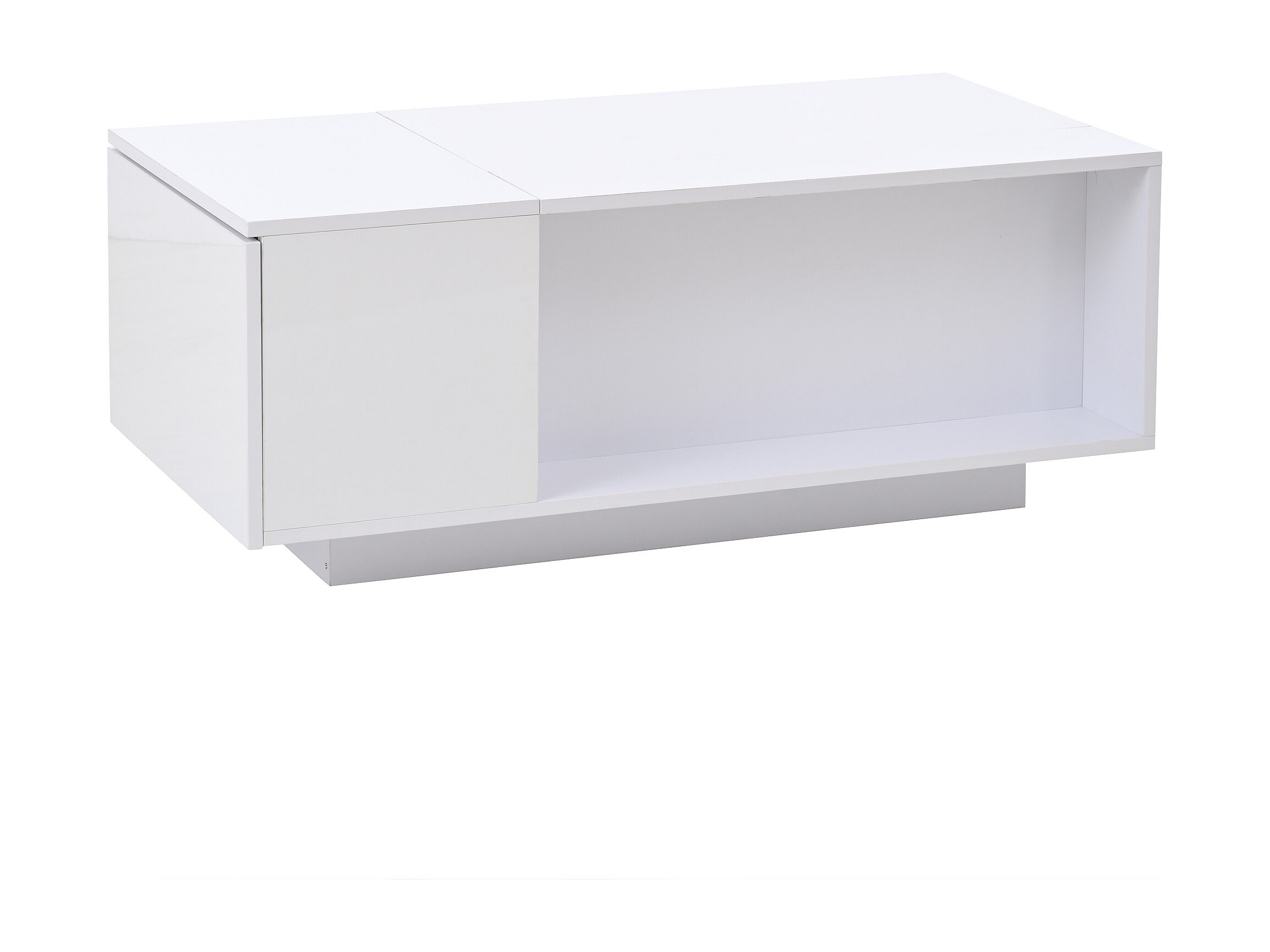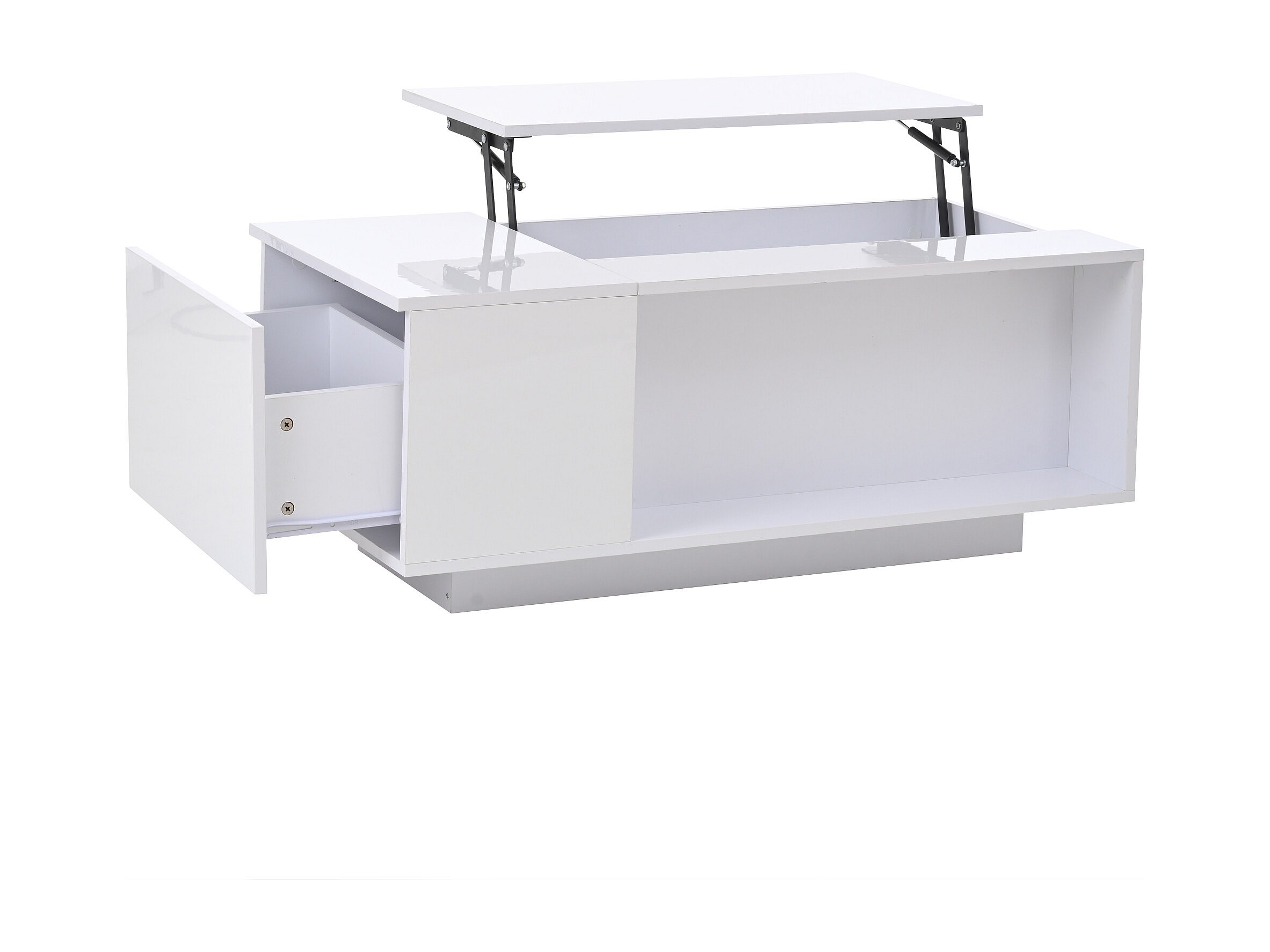 Mesa de centro blanca con tablero regulable en altura - Mesa de centro con iluminación LED y 1 cajón - Almacenaje abierto