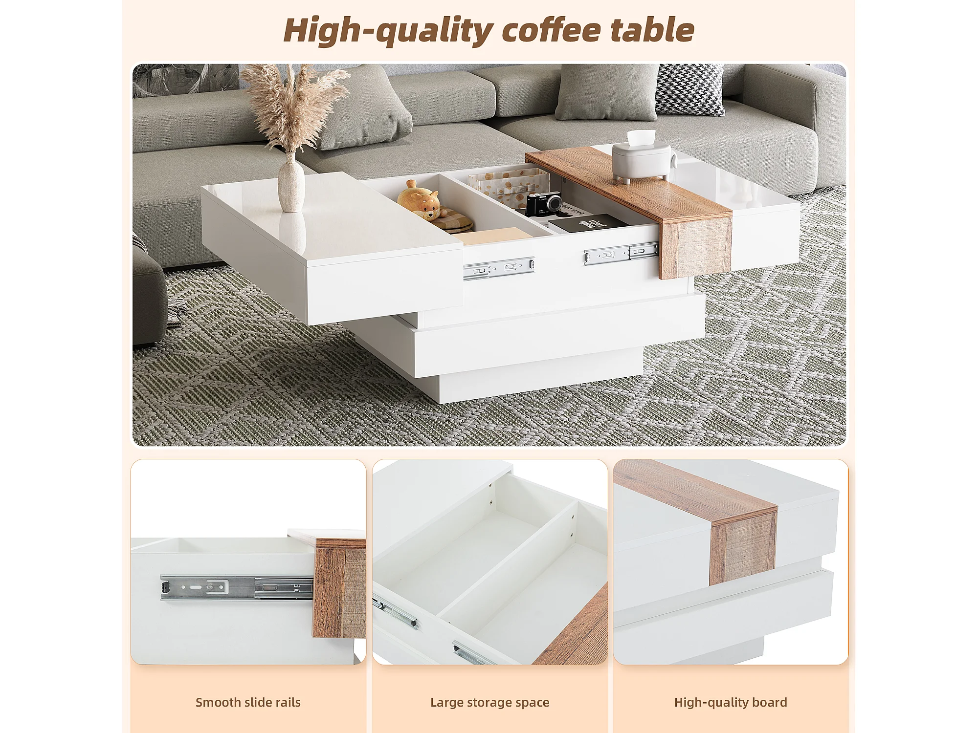 Mesa de centro blanca con tapa deslizante, 2 compartimentos de almacenamiento, 70x70x39 cm - Madera natural