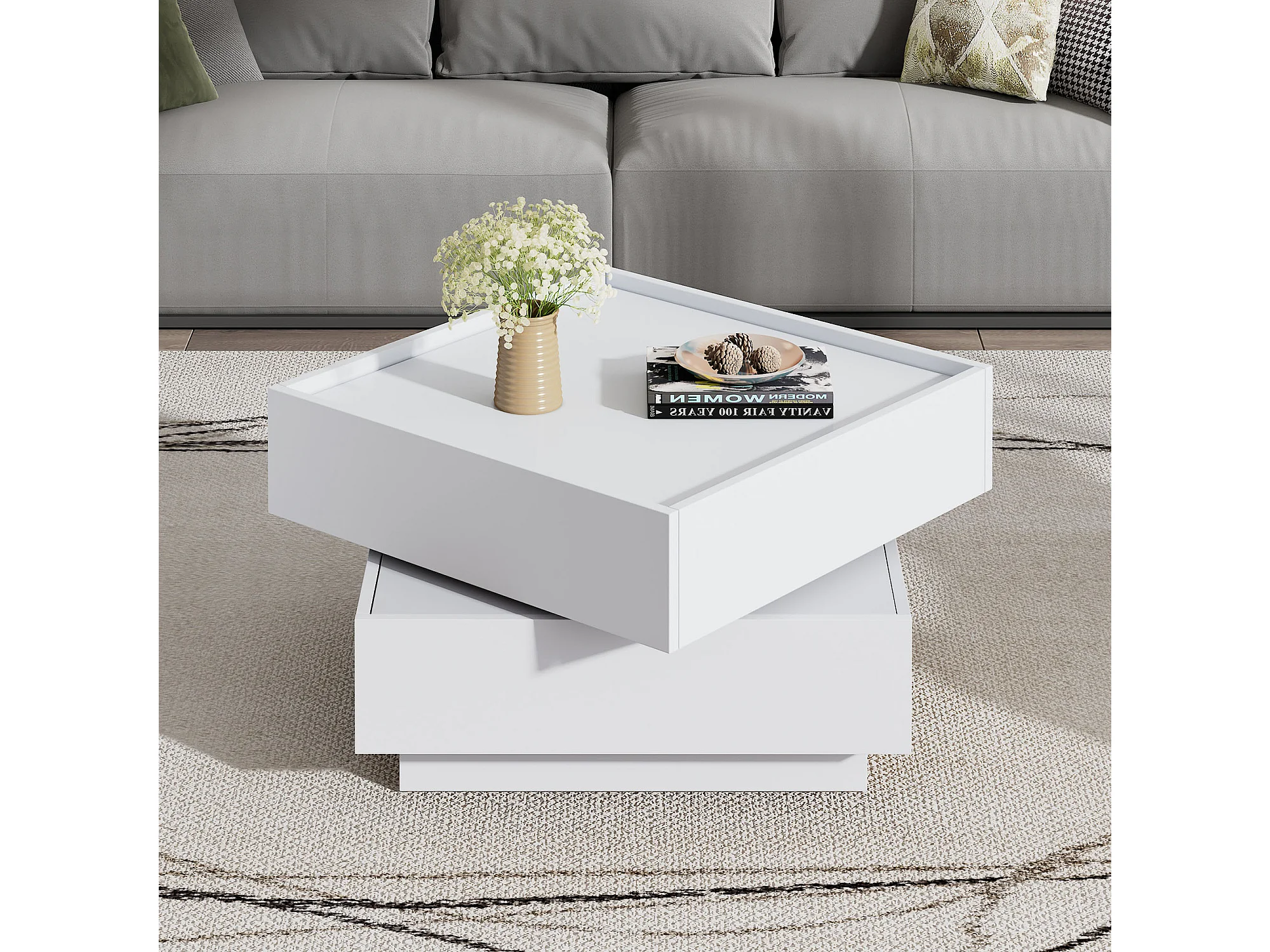 Mesa de centro con 2 cajones, tapa giratoria 360°, blanca