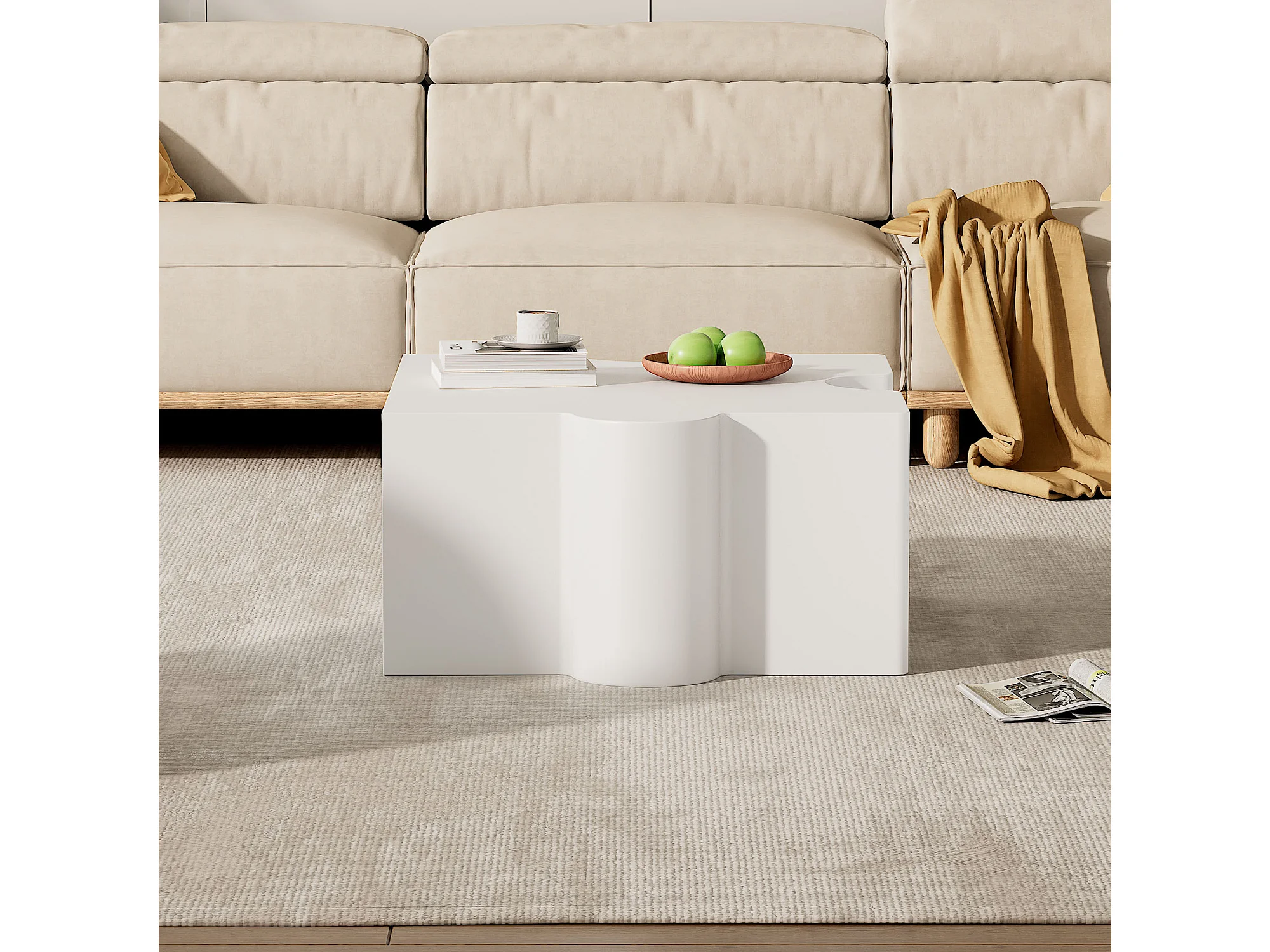 Mesa de centro asimétrica, elegante y robusta, con espacio de almacenamiento, color blanco