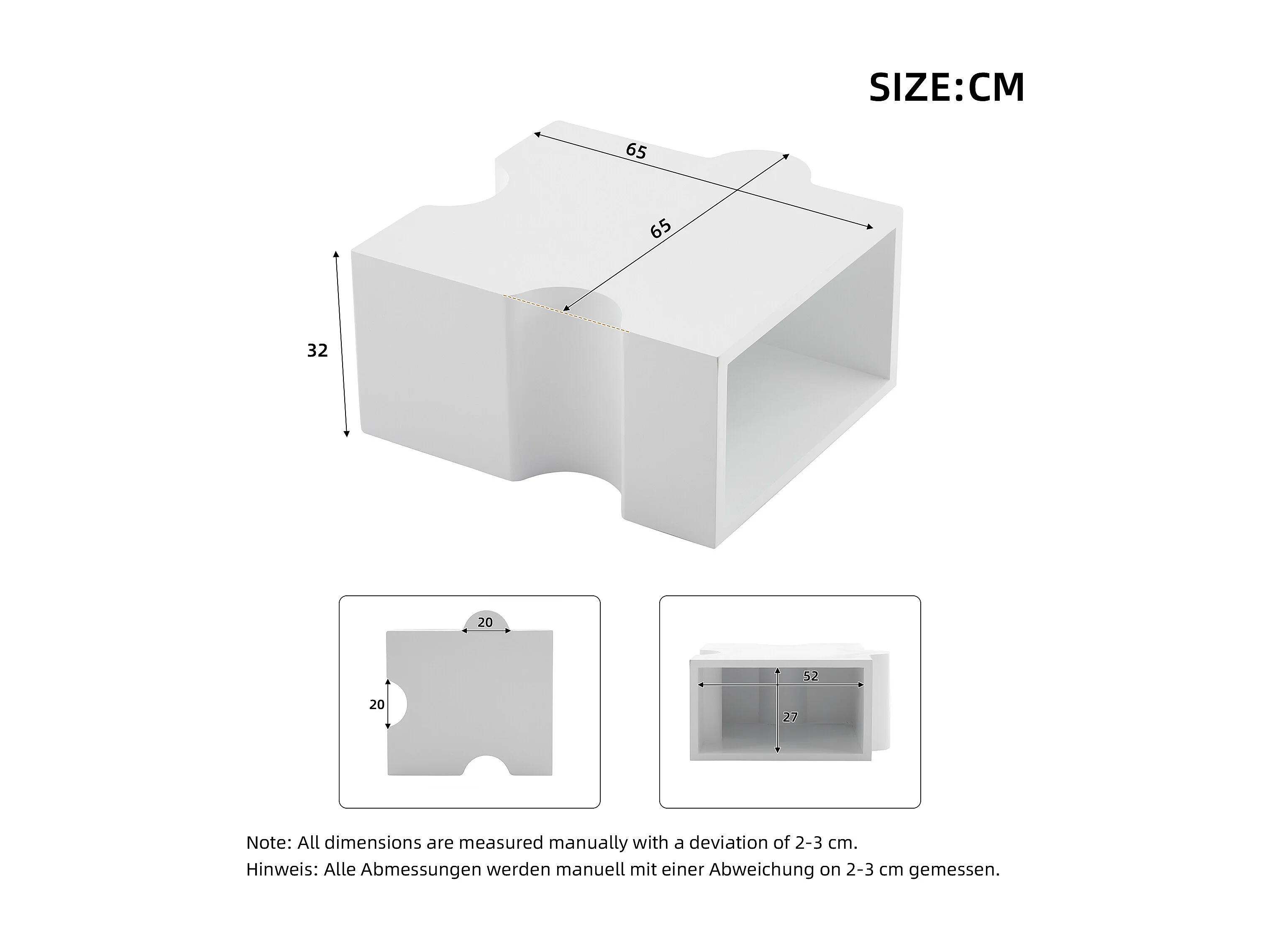 Mesa de centro única - 65 x 65 x 32 cm - con diseño de puzle - arte abstracto para salón - MDF - blanco
