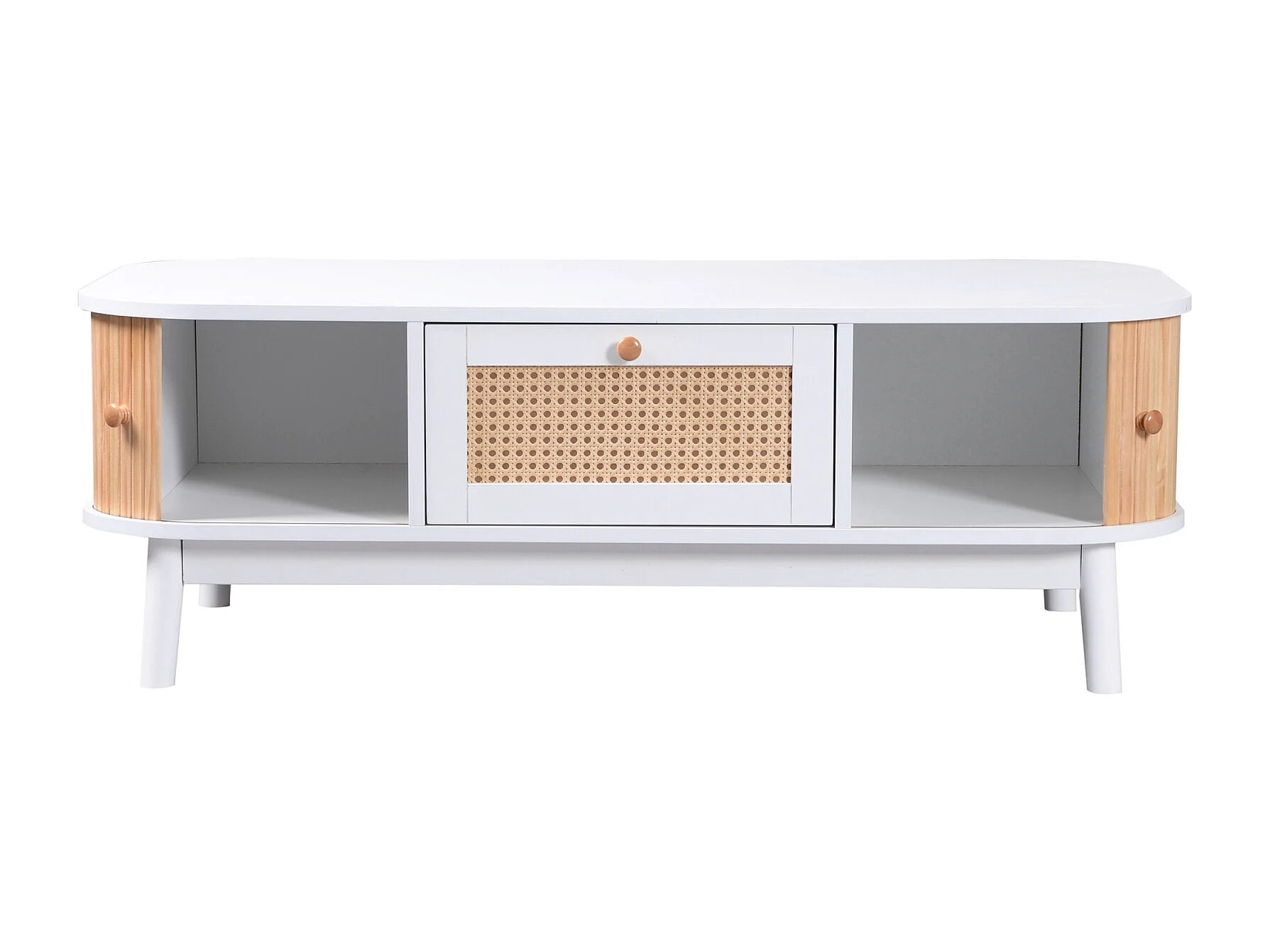 Mesa de centro con cajones y puertas correderas, mesa de salón con espacios de almacenamiento, color blanco.