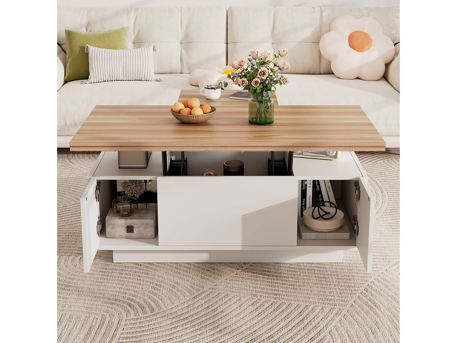 Mesa de centro elevable 120x50x43 cm - con almacenamiento - Patas de metal - MDF - Blanco + Natural