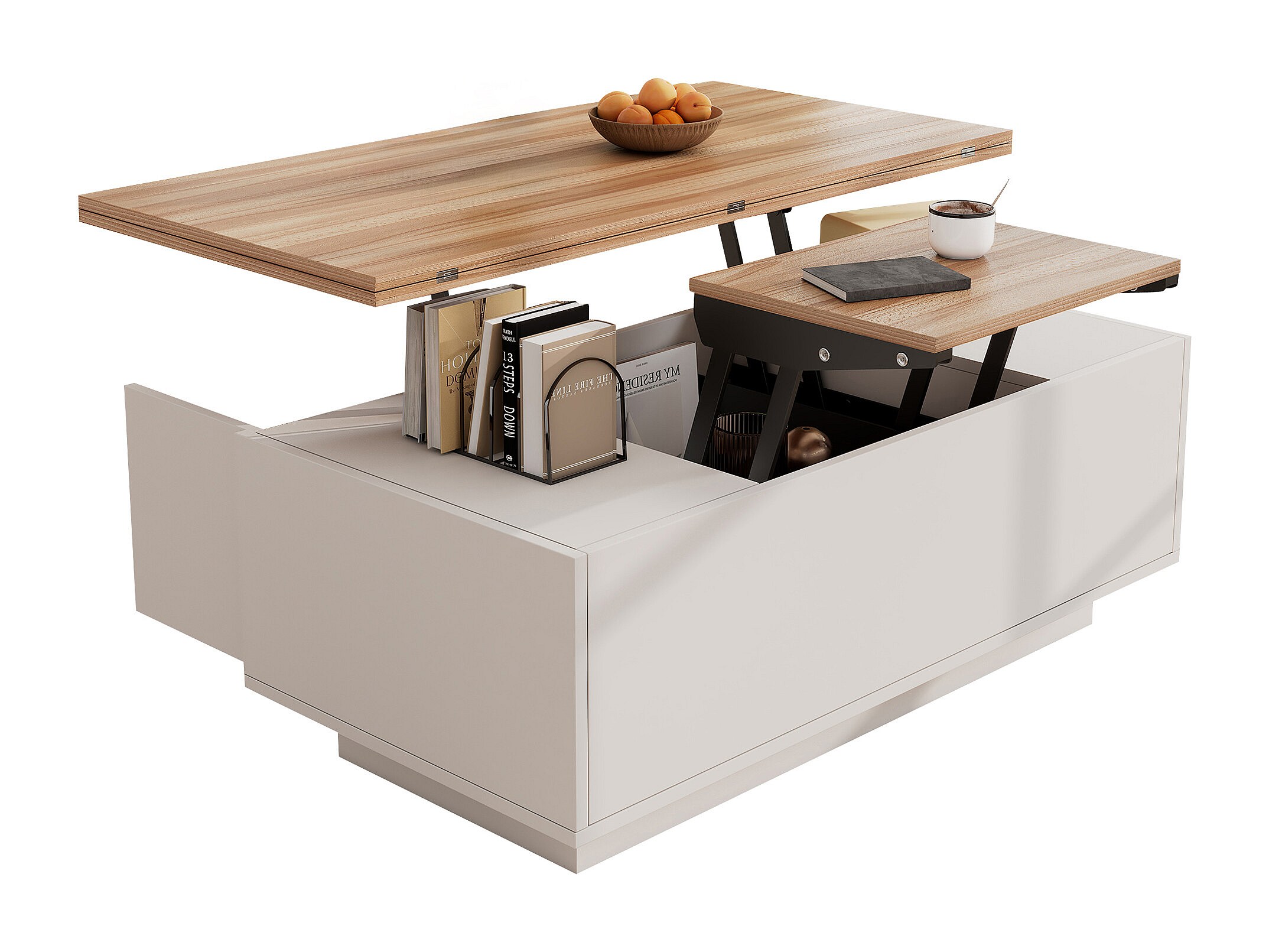 Mesa de centro con tablero de madera elevable doble - Mesa de centro de 2 puertas - almacenamiento oculto - blanco