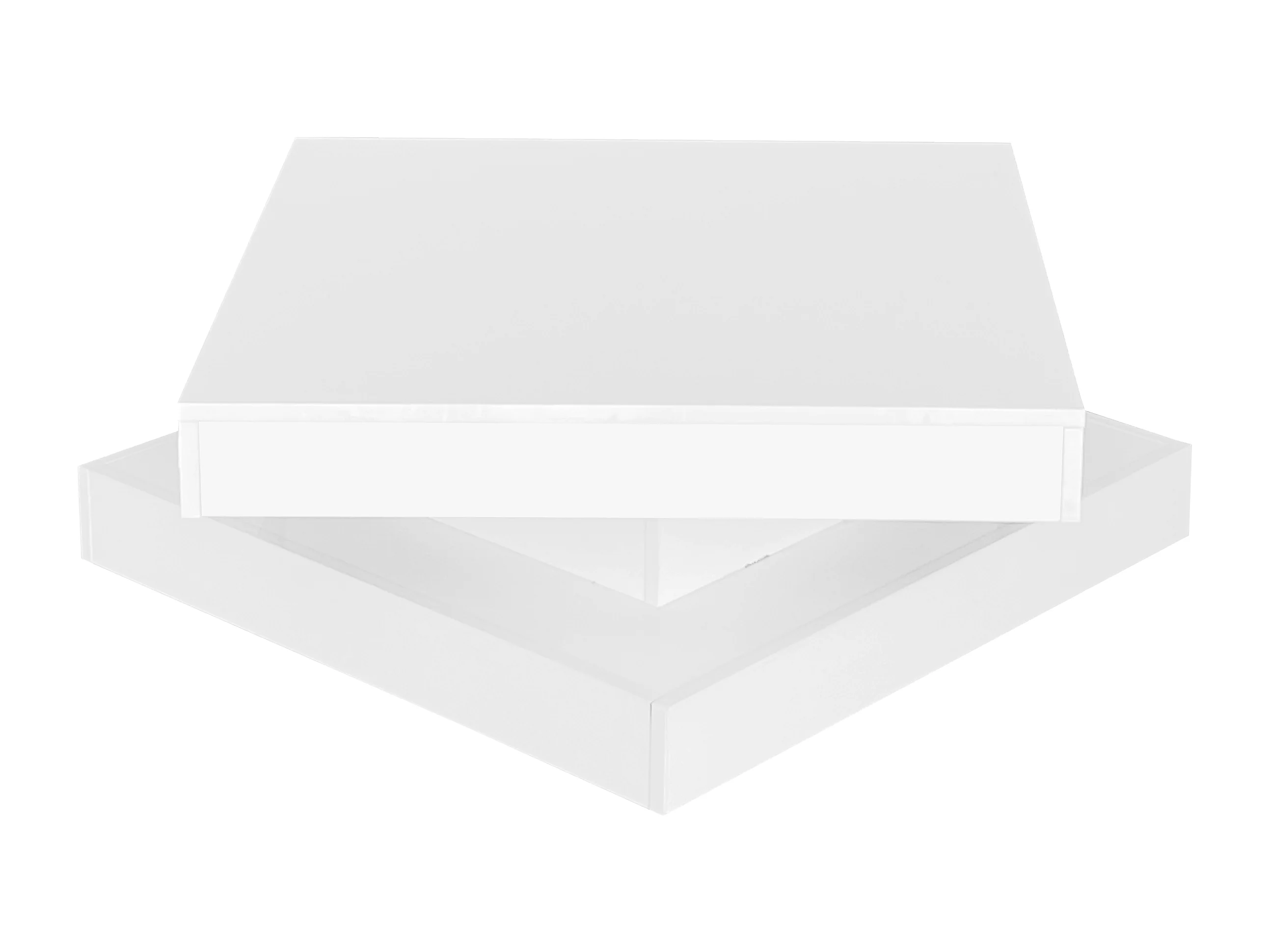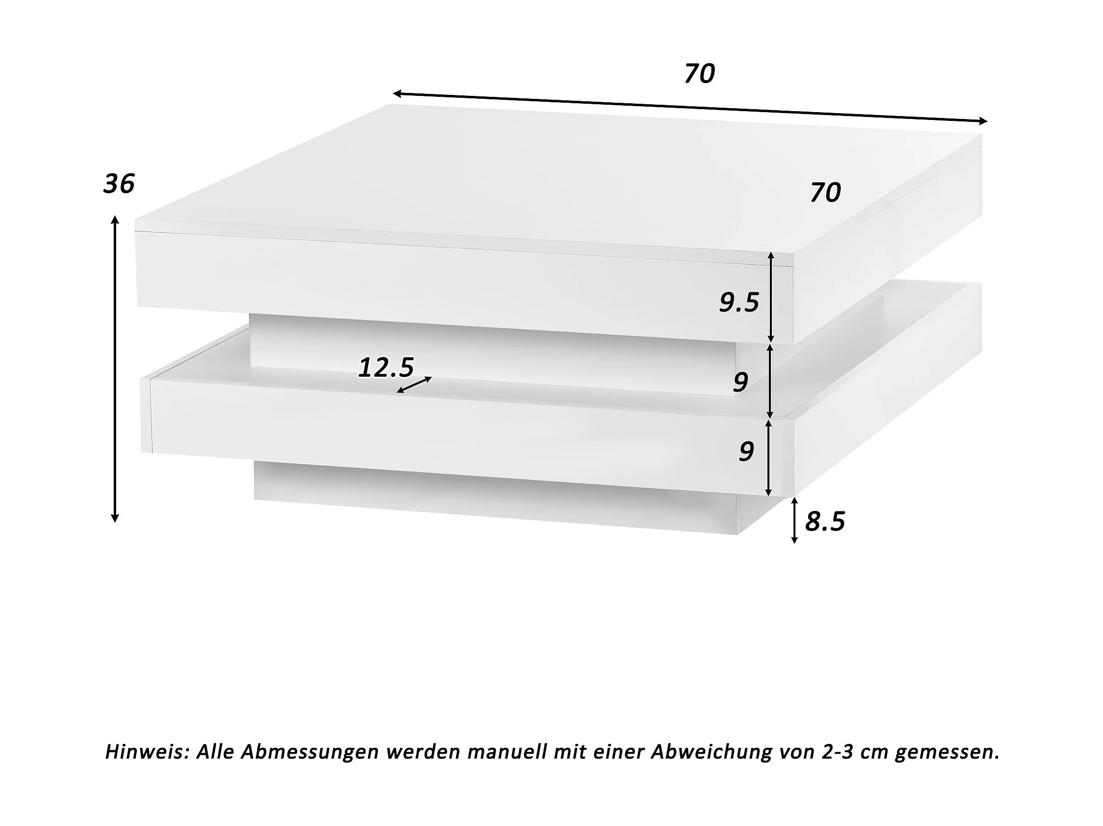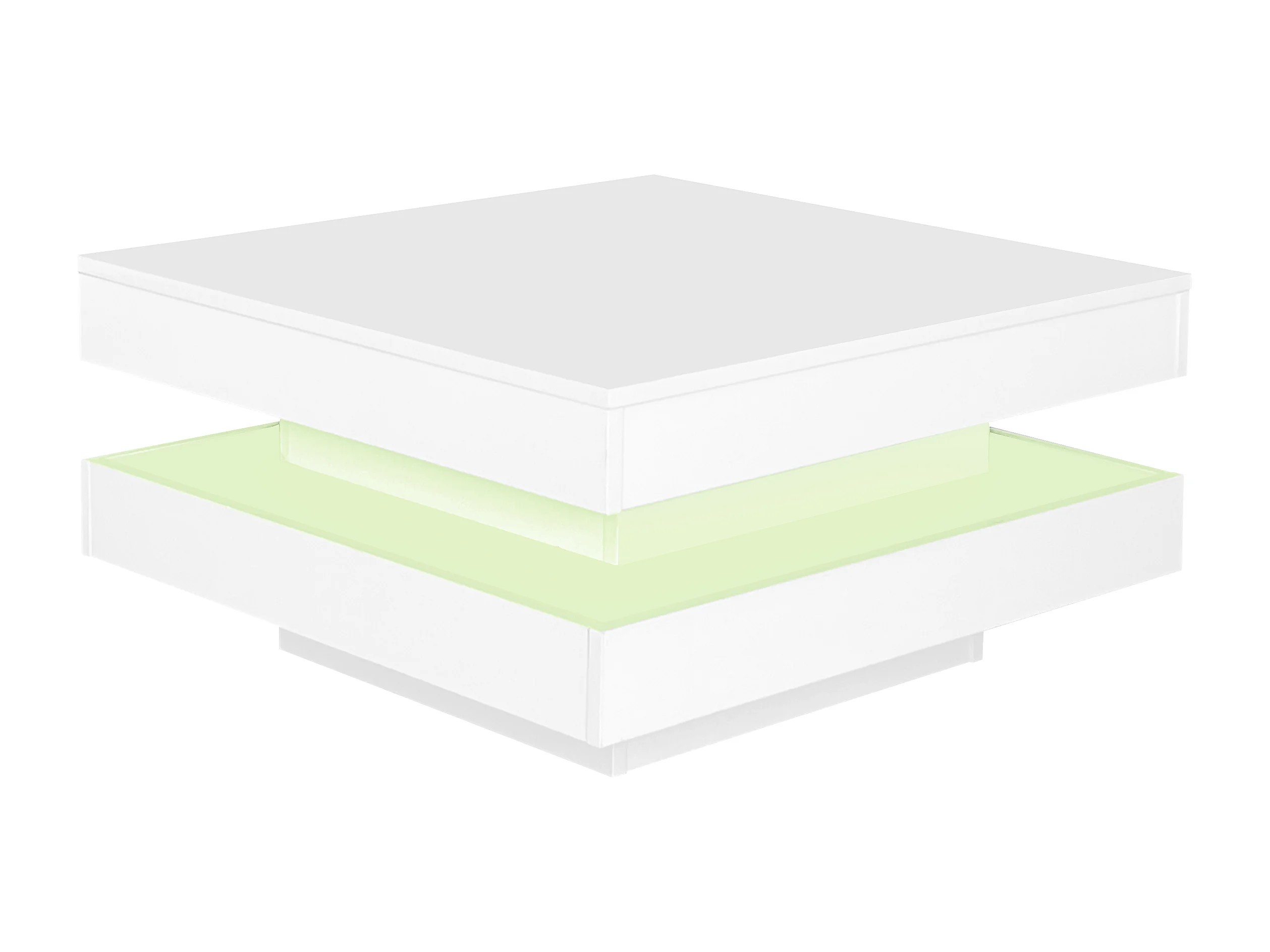 Mesa de centro cuadrada blanca con iluminación LED, tapa giratoria y acabado brillante.