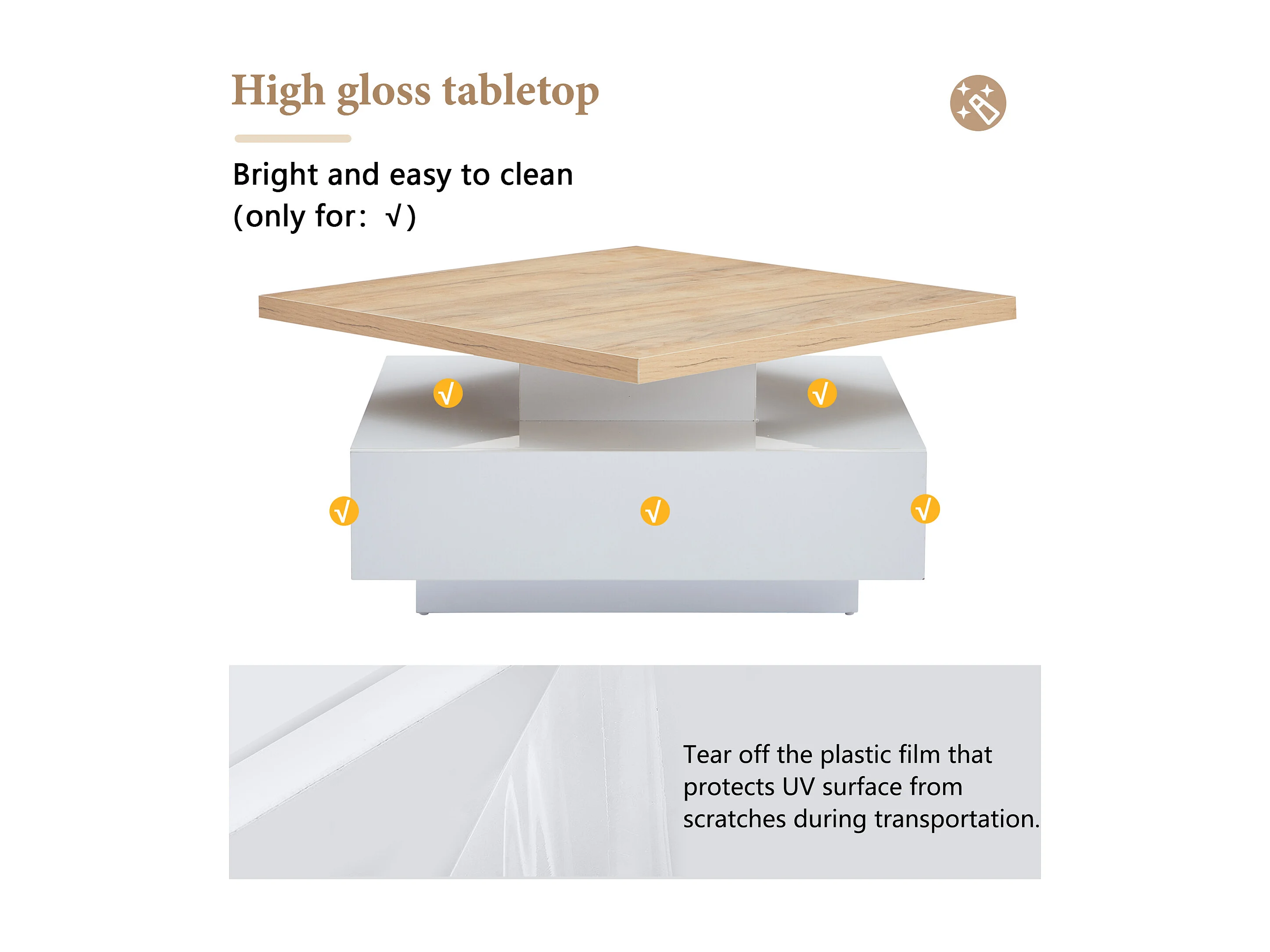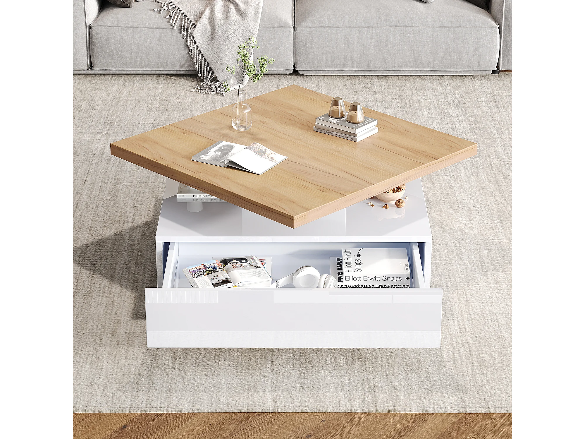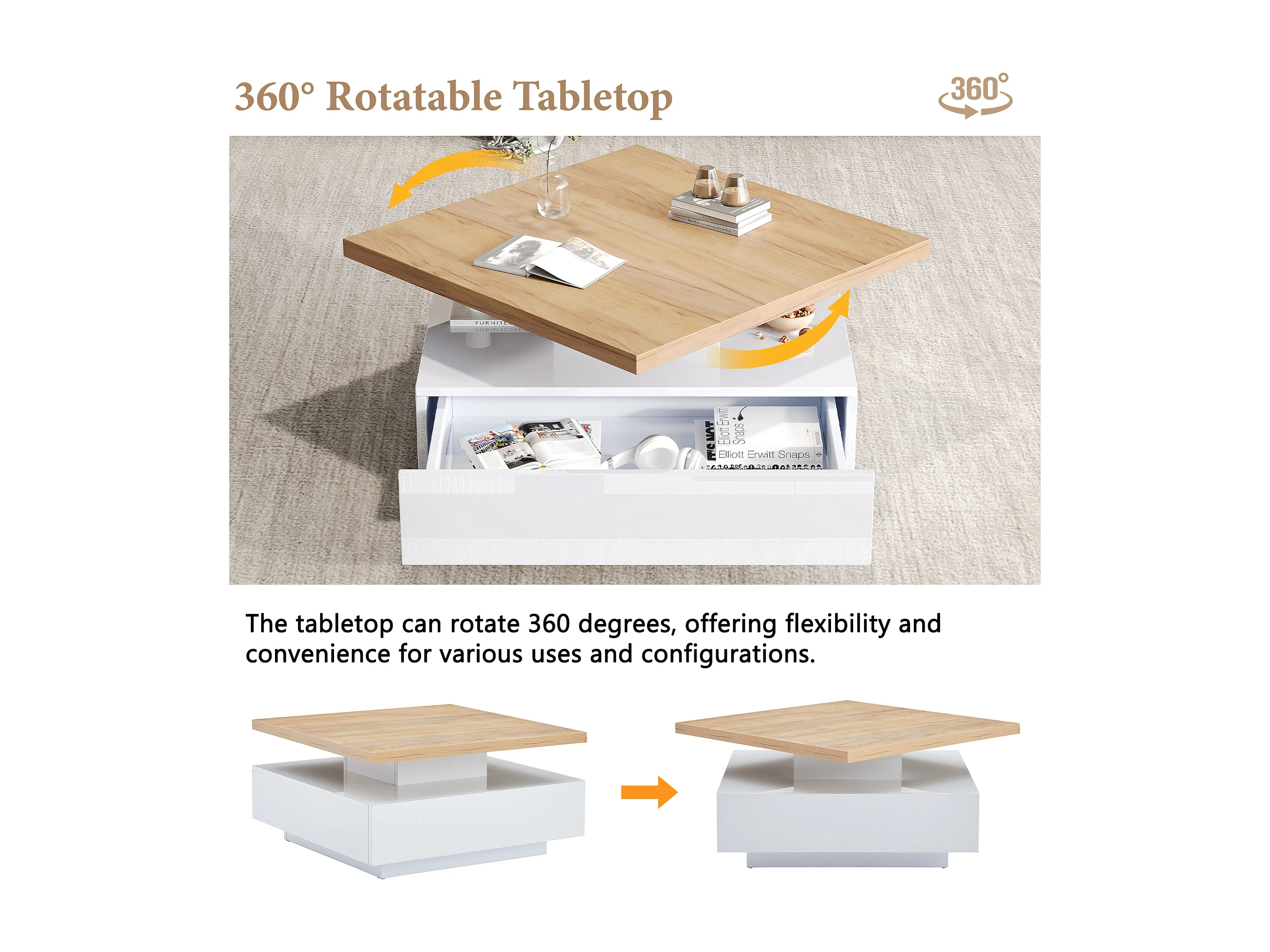 Mesa de centro cuadrada, blanca, giratoria 360°, con cajones de almacenamiento, 70 x 70 x 36 cm