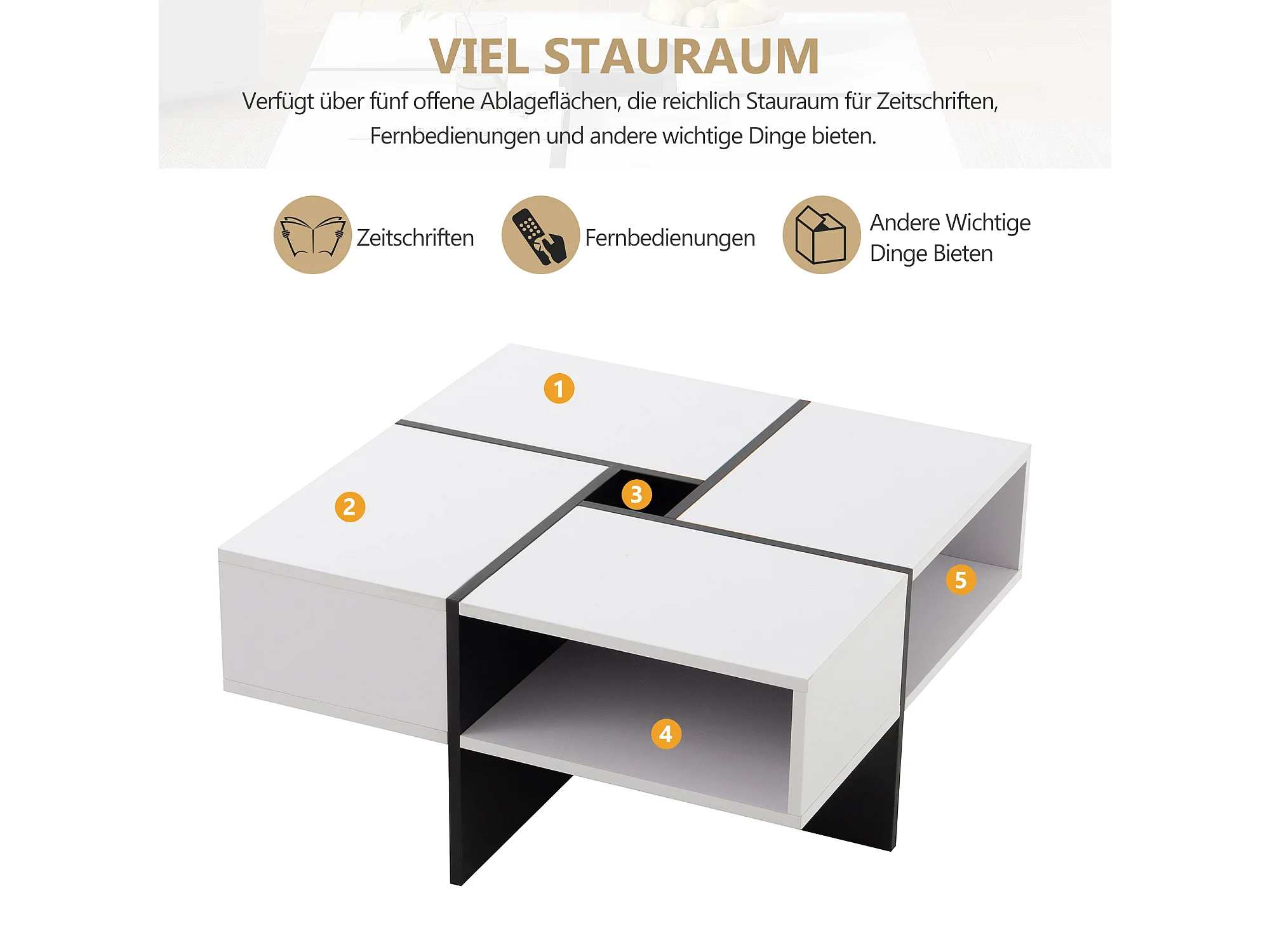 Mesa de centro cuadrada con 5 compartimentos - 70 x 70 x 35 cm - tablero de partículas - blanco