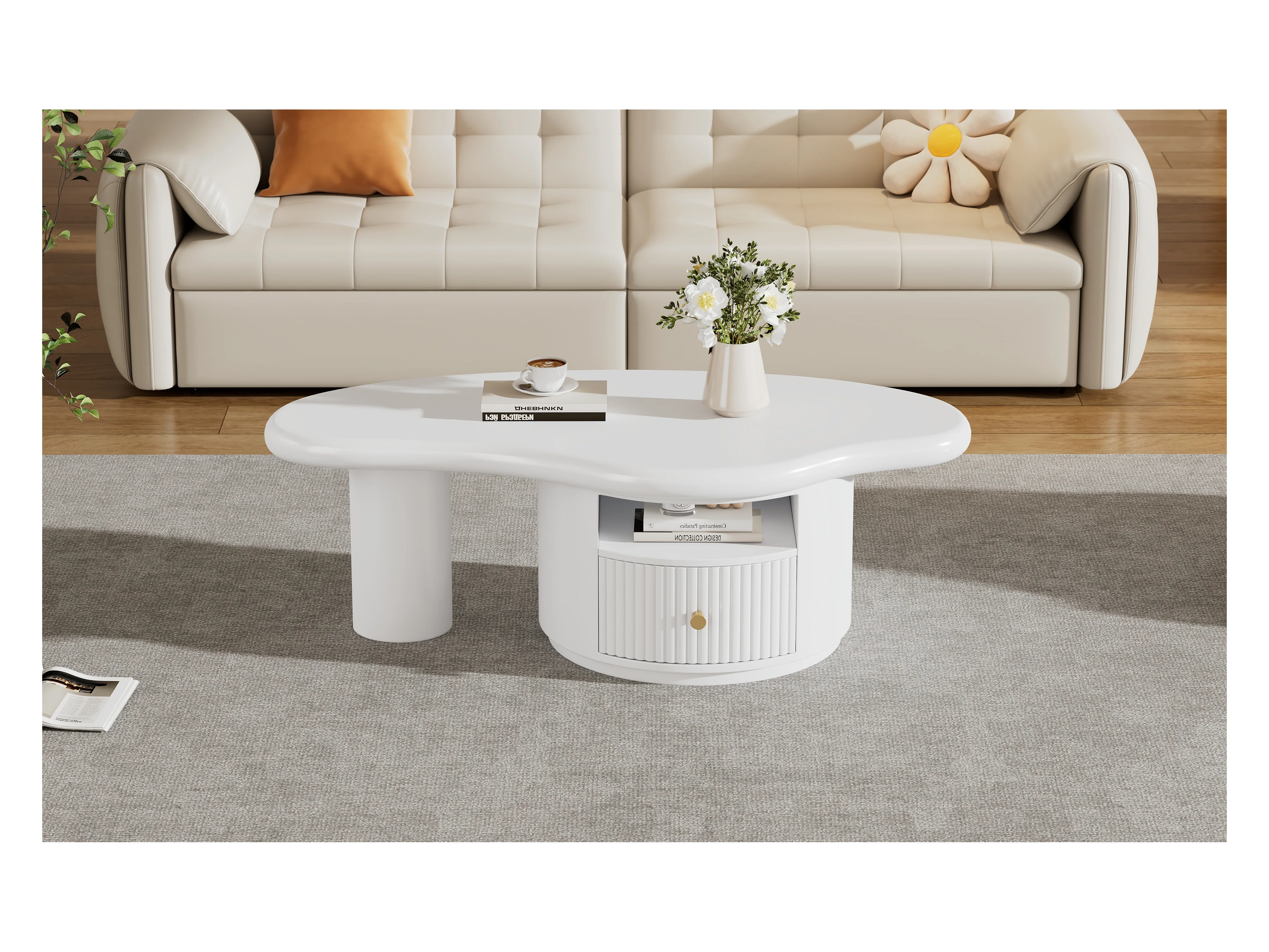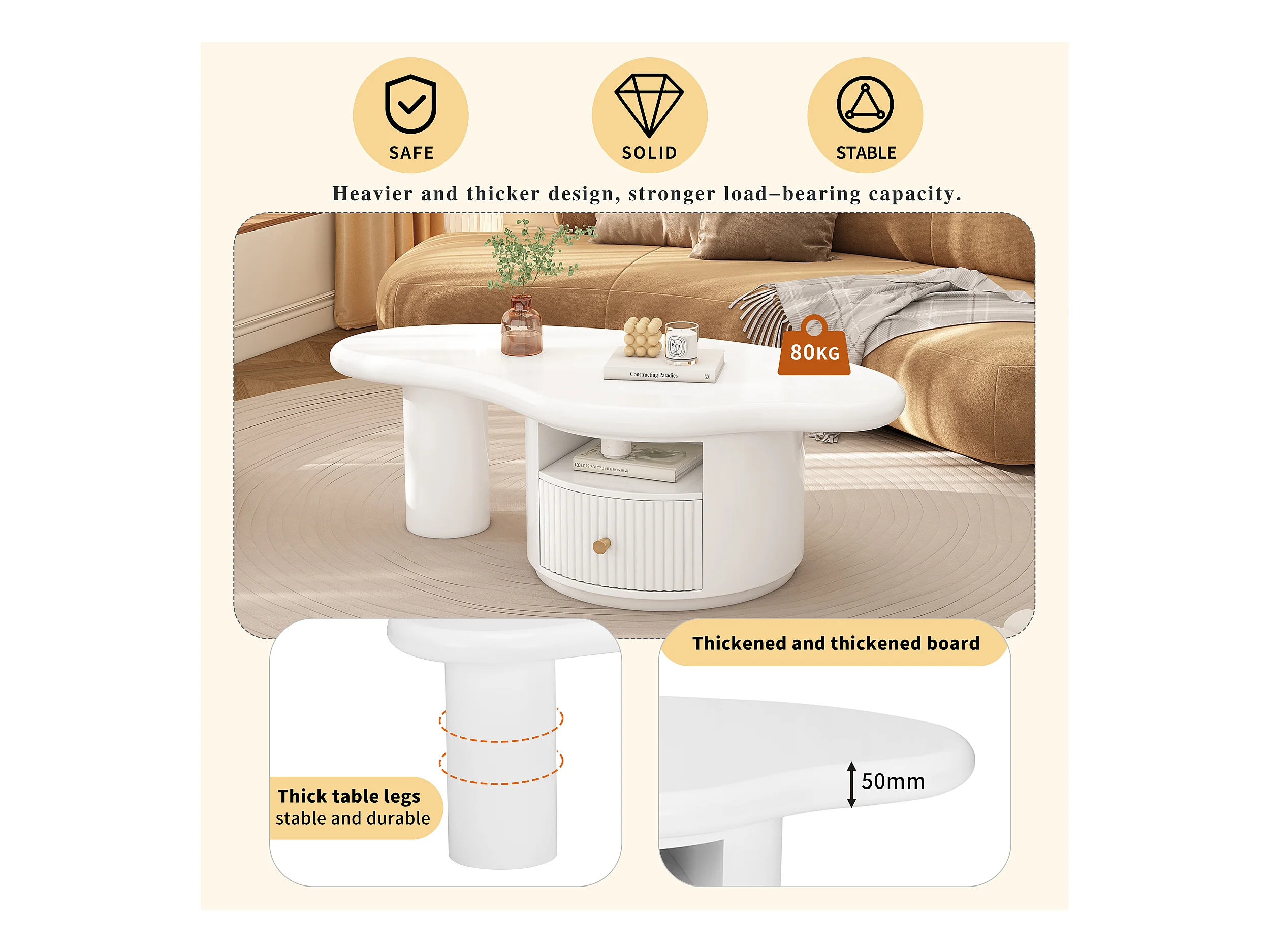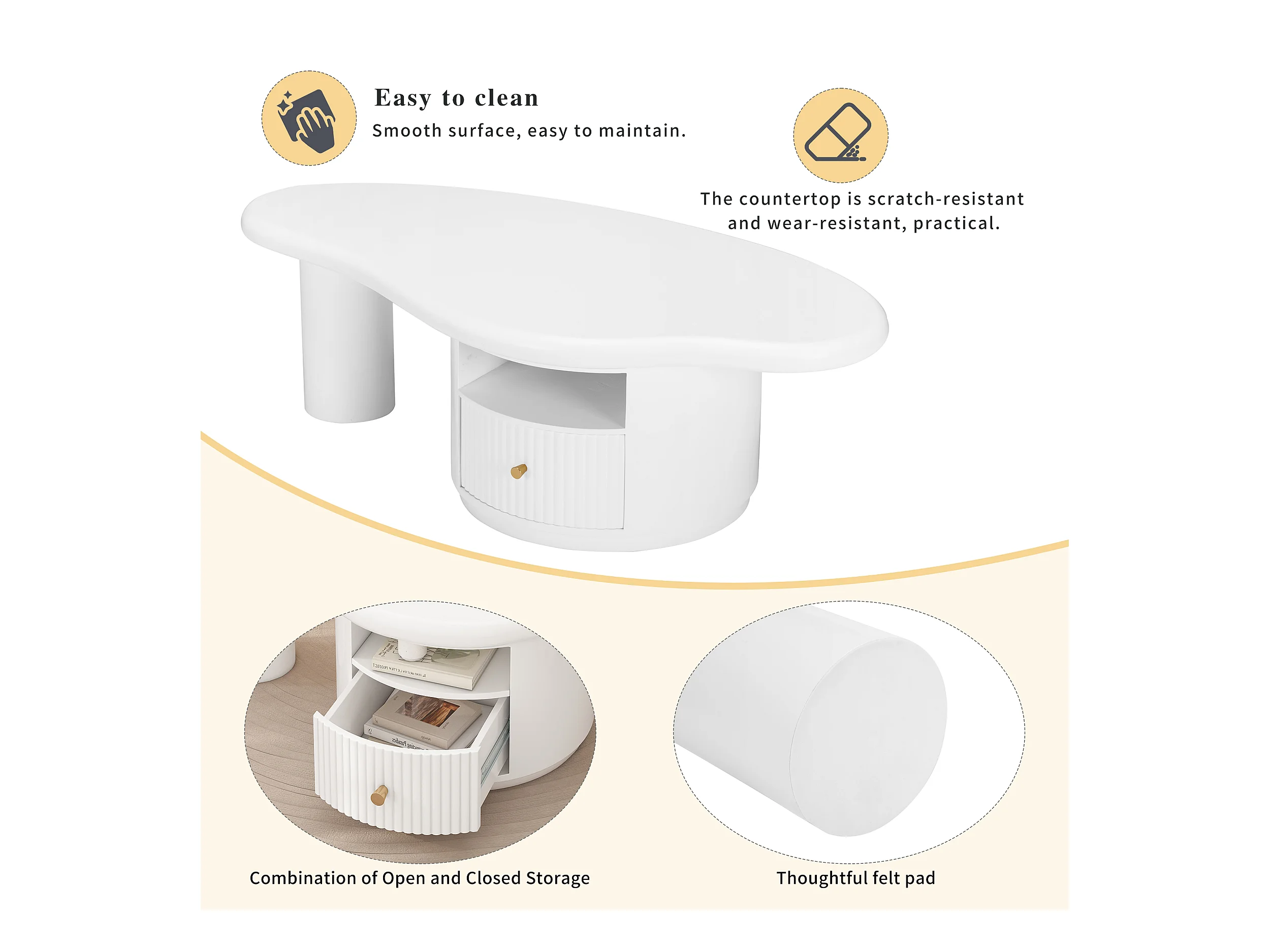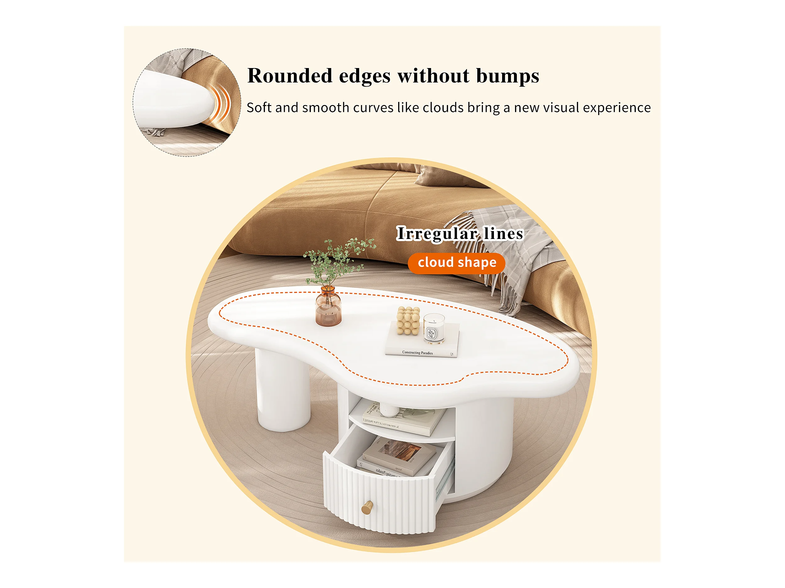 Mesa de centro de diseño en forma de nube, tablero de MDF, 1 cajón, patas de fieltro, color blanco (110x60x37,5cm)
