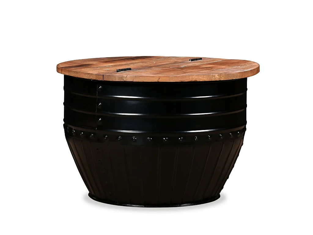 Mesa de centro industrial de madera de mango Rita con almacenamiento redondo de metal negro