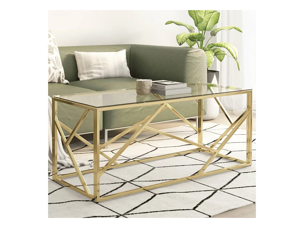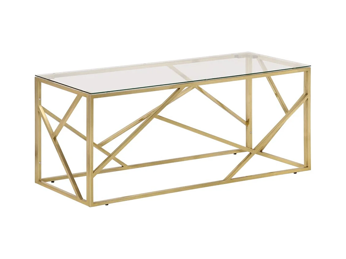 Mesa de centro dorada en acero inoxidable y cristal templado.