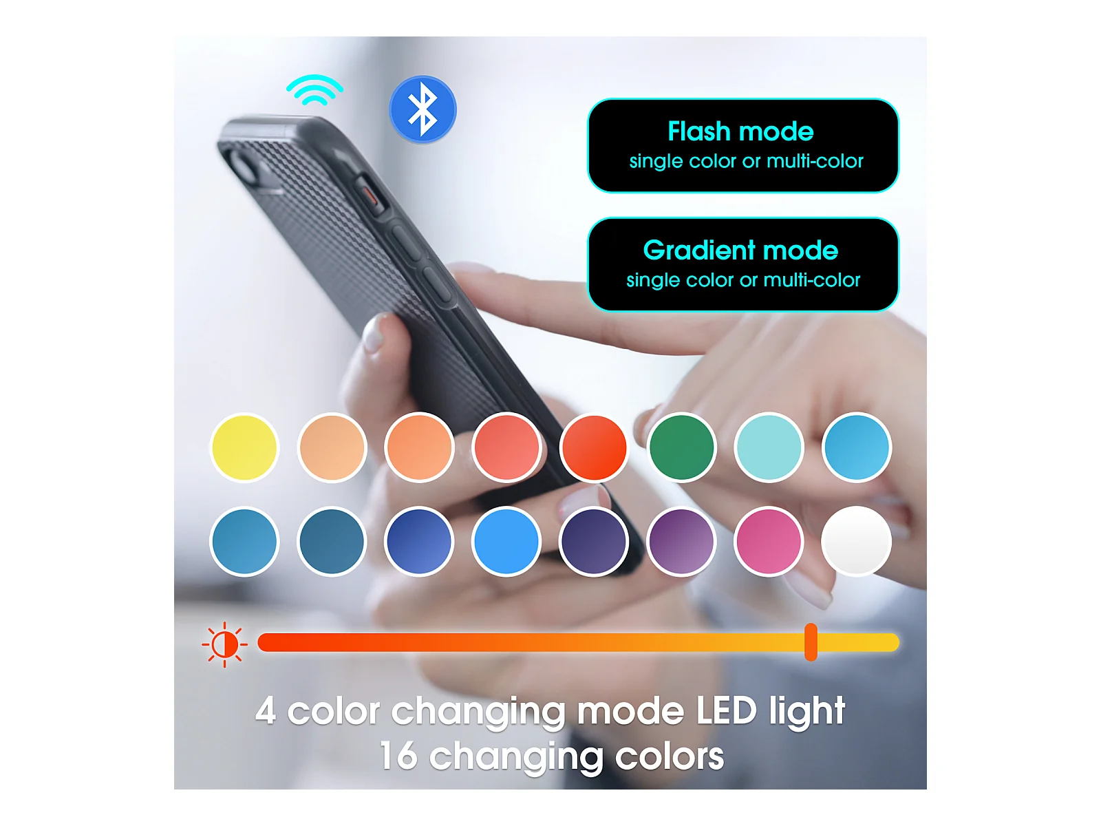 Mesa de centro flotante LED, negra, con tablero de vidrio templado e iluminación LED controlada por app y control remoto.