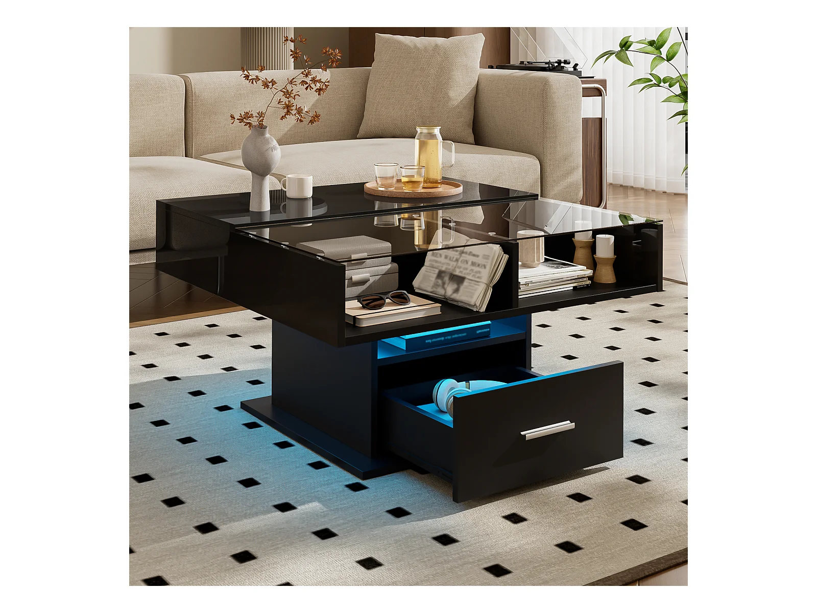 Mesa de centro elevable con almacenaje, acabado brillante y LED, altura regulable, mueble de salón moderno multifuncional también ideal para oficina, Color Negro