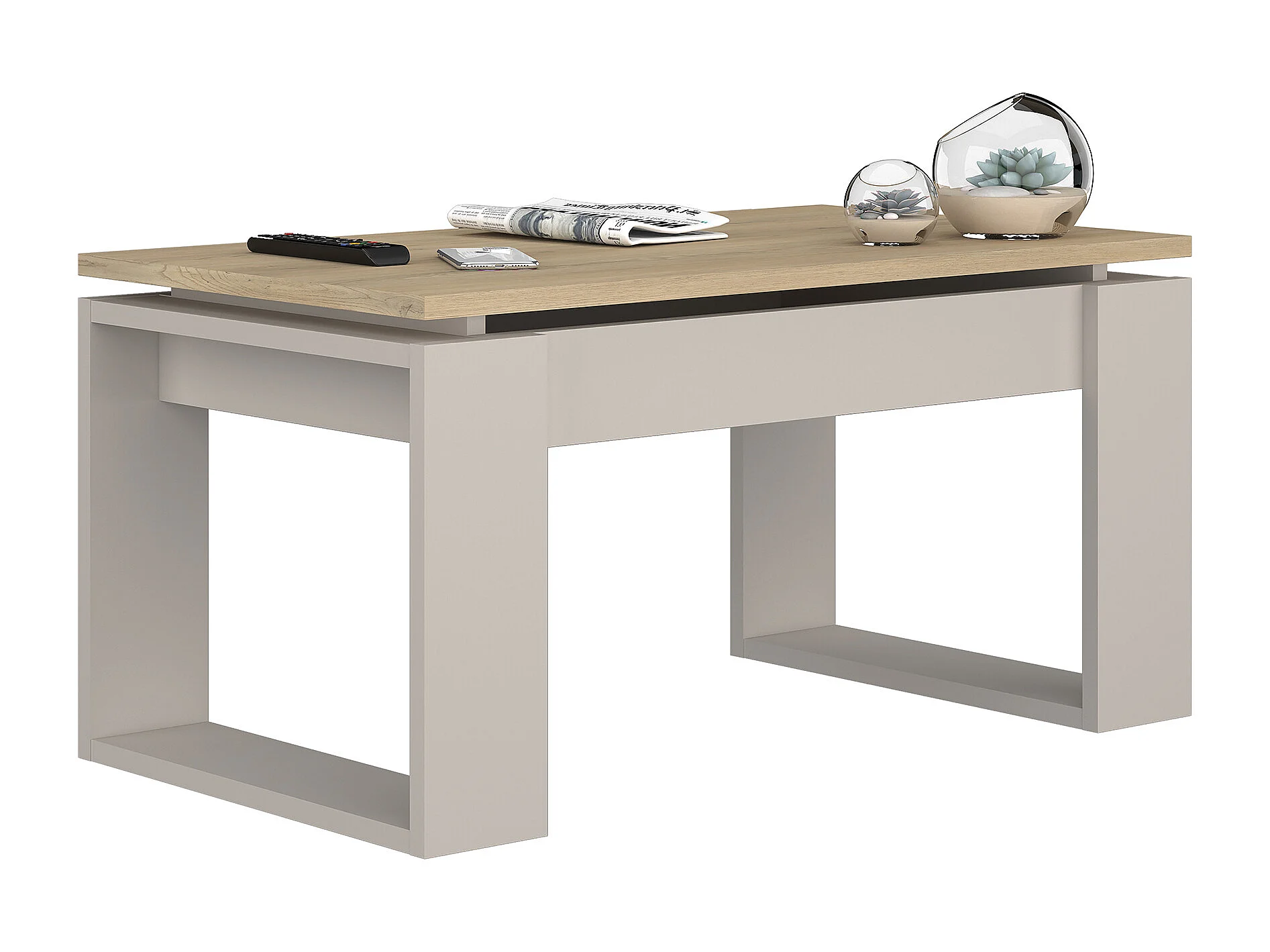 Mesa de centro elevable de 45x90x50 cm con almacenaje interior en roble y beige Rubi II