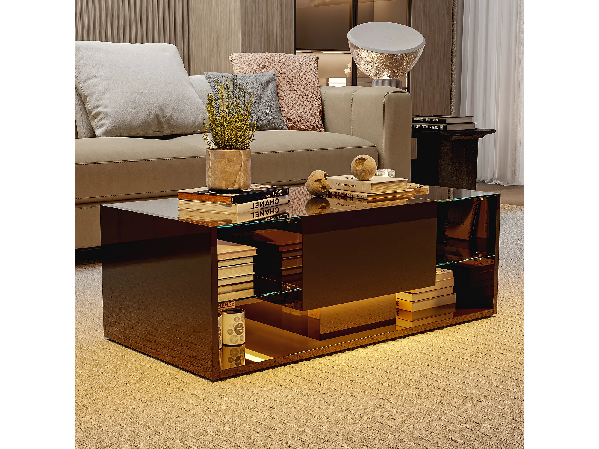 Mesa de centro elevable con almacenaje, acabado brillante y LED, altura regulable, mueble de salón moderno multifuncional también ideal para oficina, Color Negro