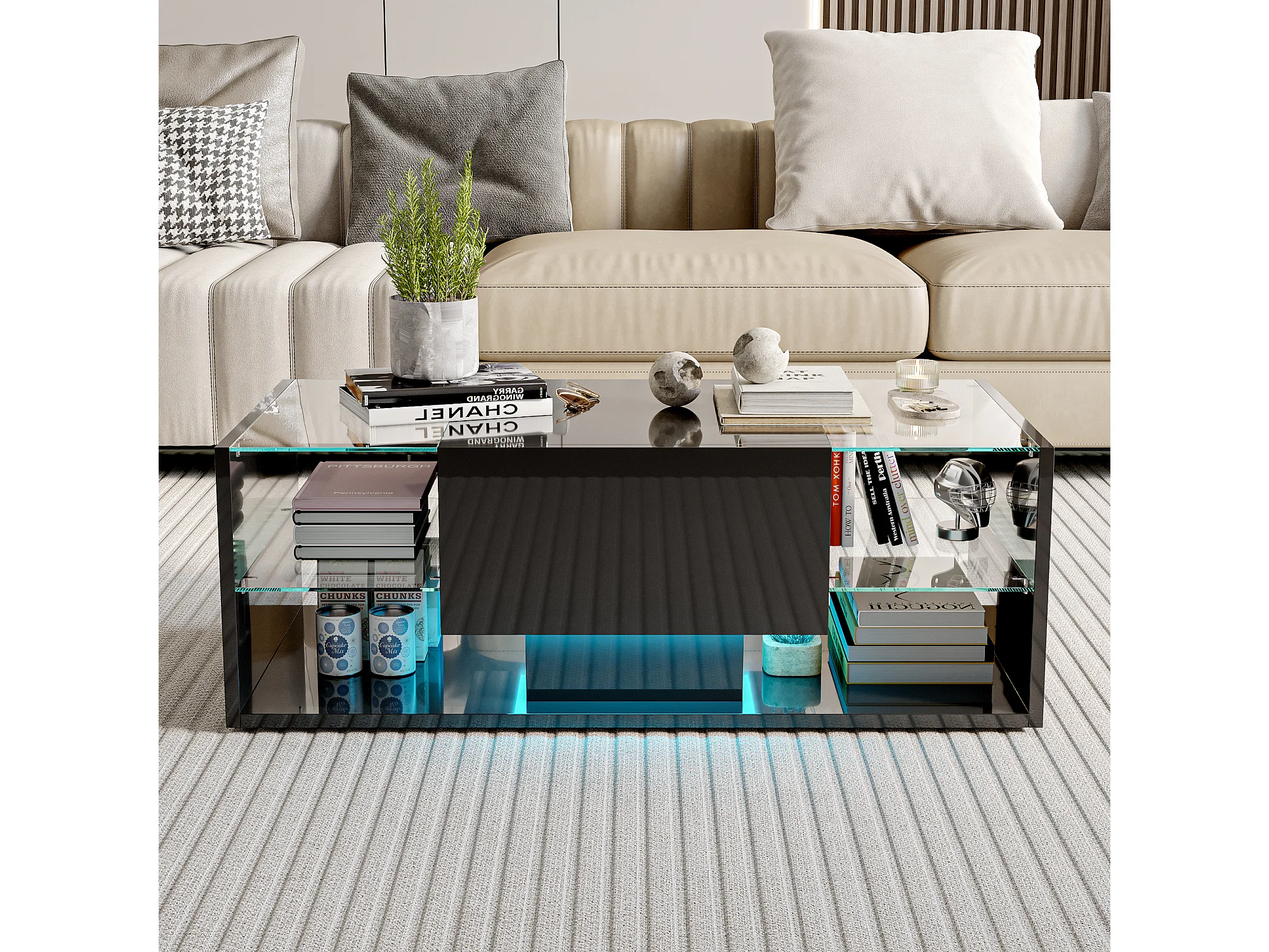 Mesa de centro flotante LED, negra, con tablero de vidrio templado e iluminación LED controlada por app y control remoto.