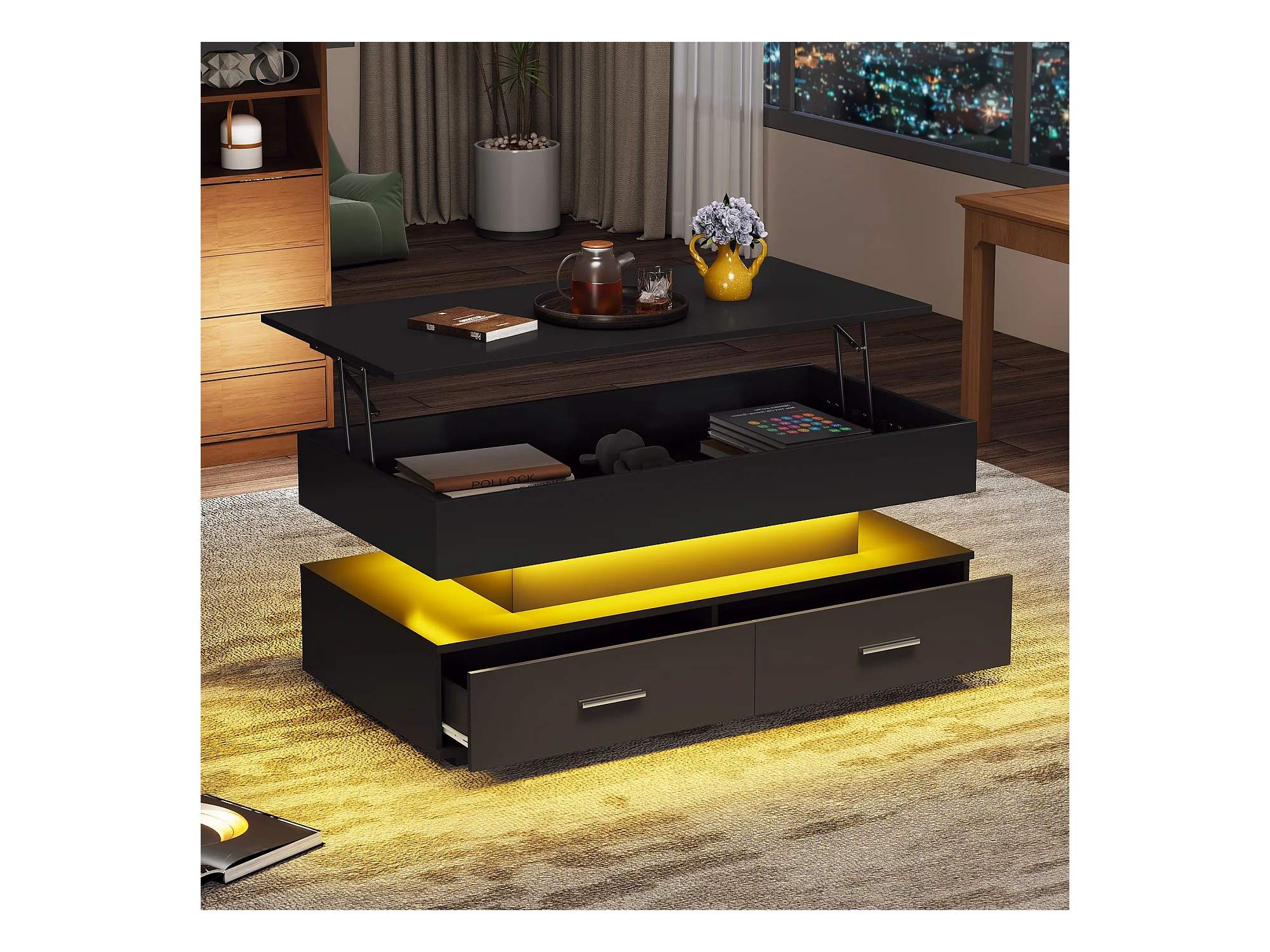 Mesa de centro LED con 2 cajones de almacenamiento y tablero regulable en altura - negra