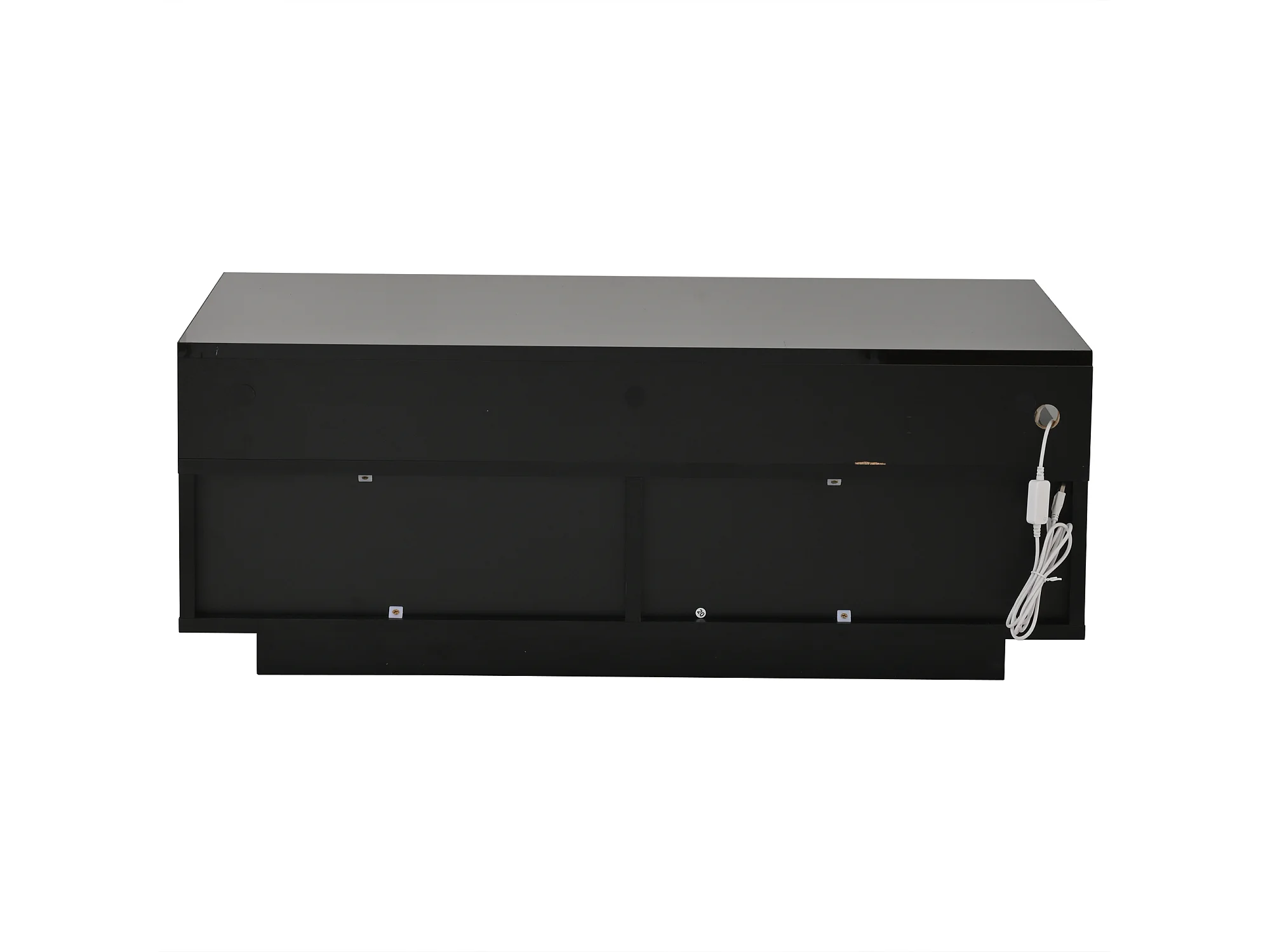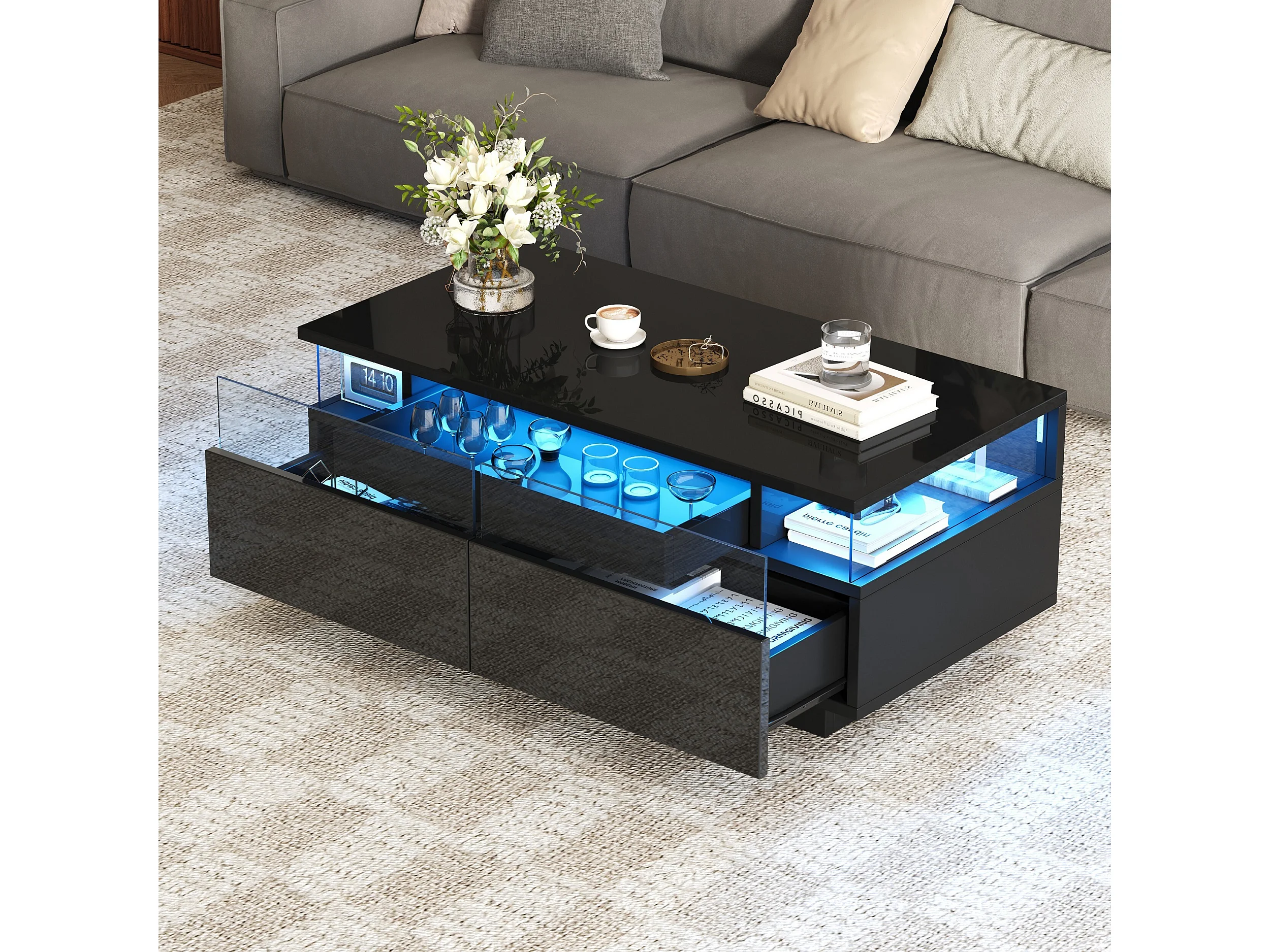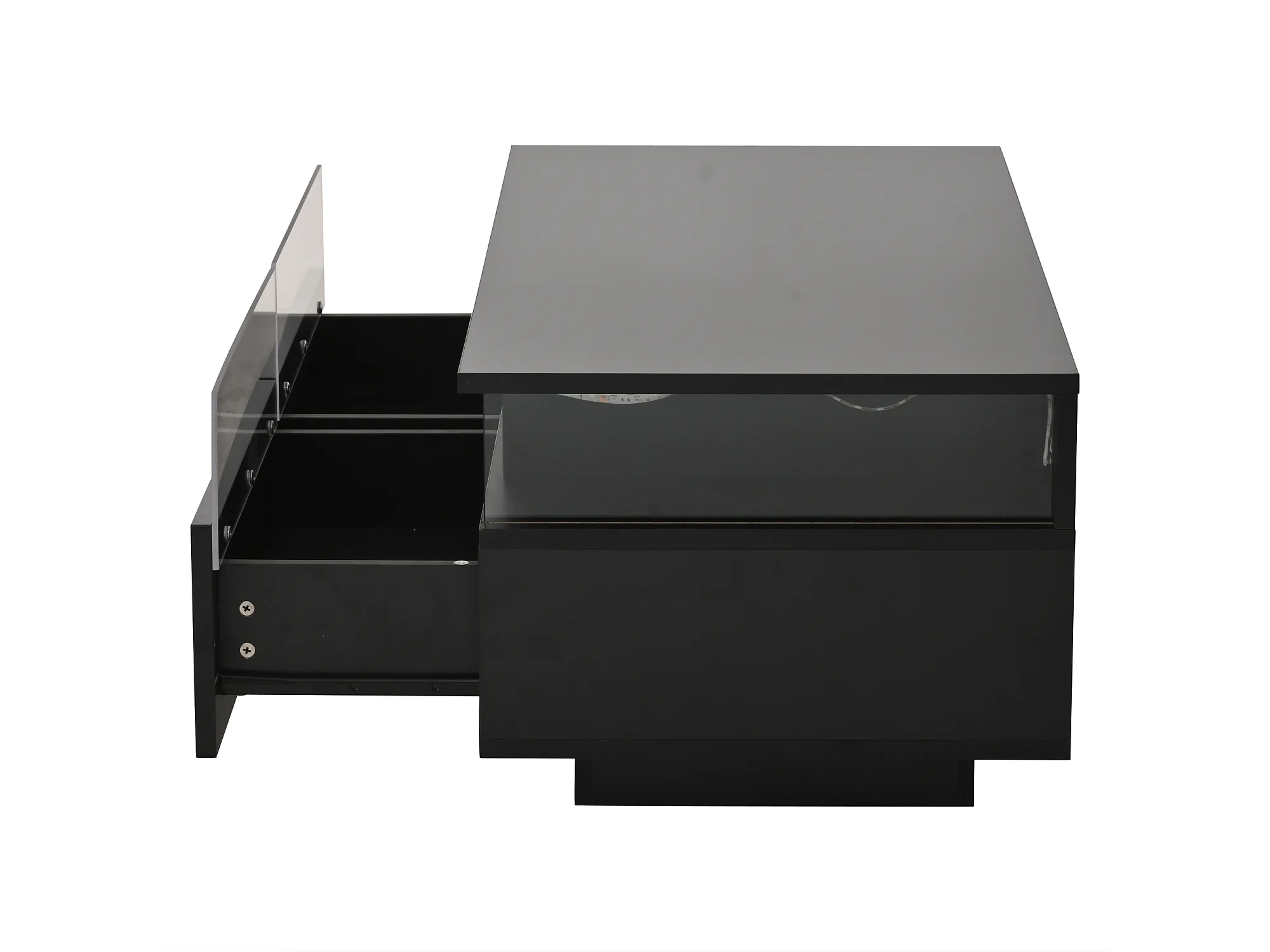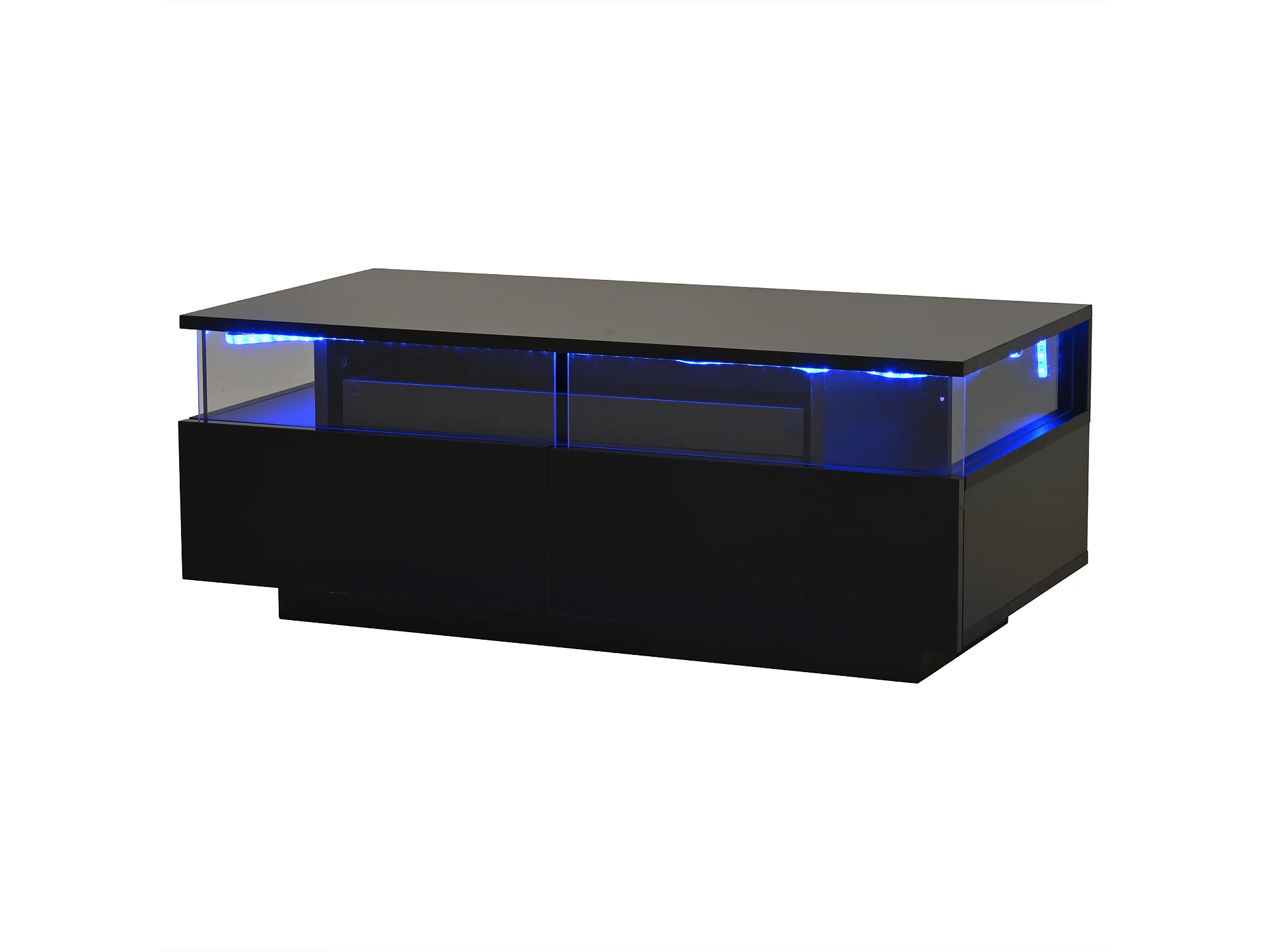 Mesa de centro LED con 2 cajones y estante extraíble, negra - para salón y oficina
