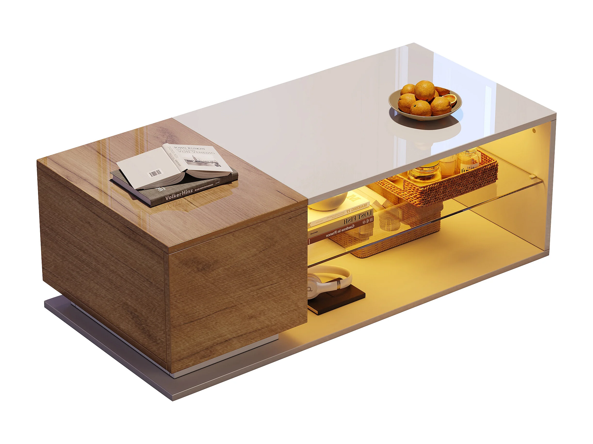 Mesa de centro LED moderna con tablero de cristal templado, espacio de almacenamiento integrado y tablero de partículas de roble y blanco (105 x 50 x 36 cm)