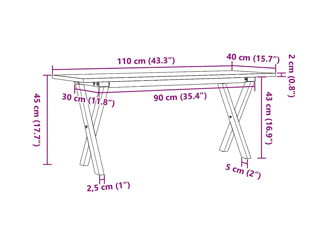 Mesa de centro marco X madera maciza pino y acero 110x40x45 cm