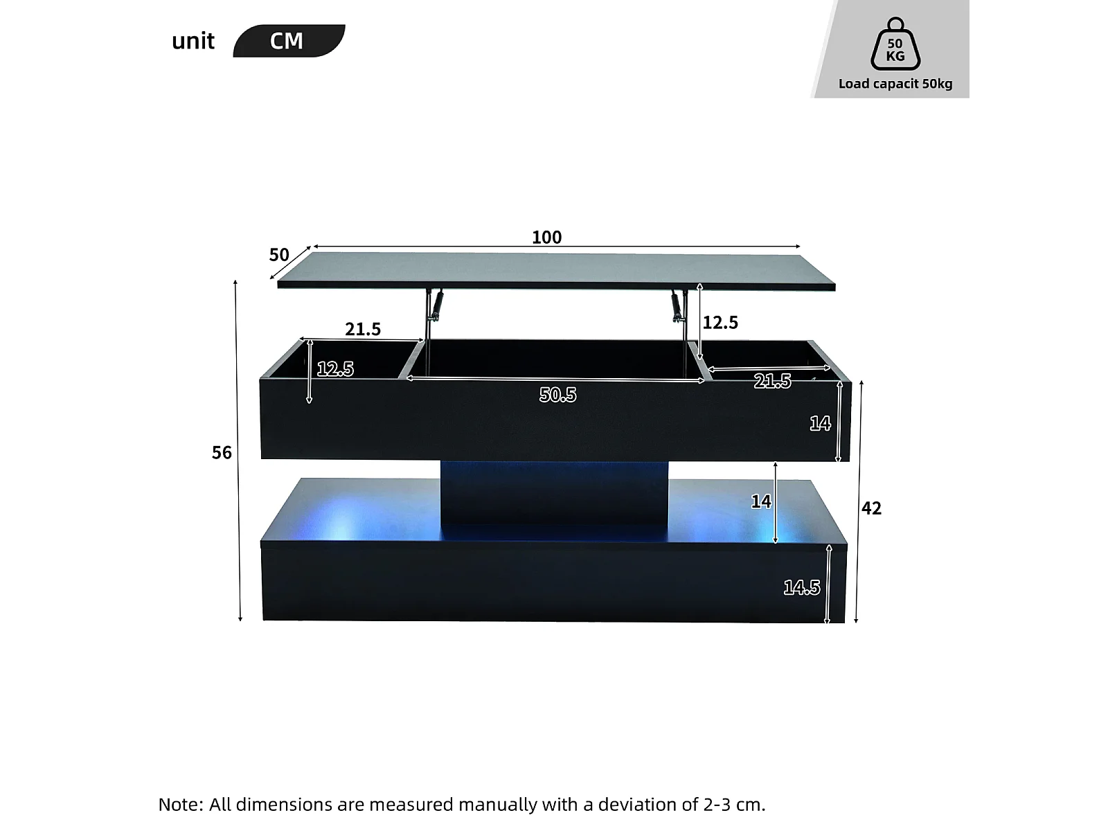 Mesa de centro elevable con luz LED, almacenamiento oculto, puerto USB y de carga, 100 x 50 x 35 cm, negra