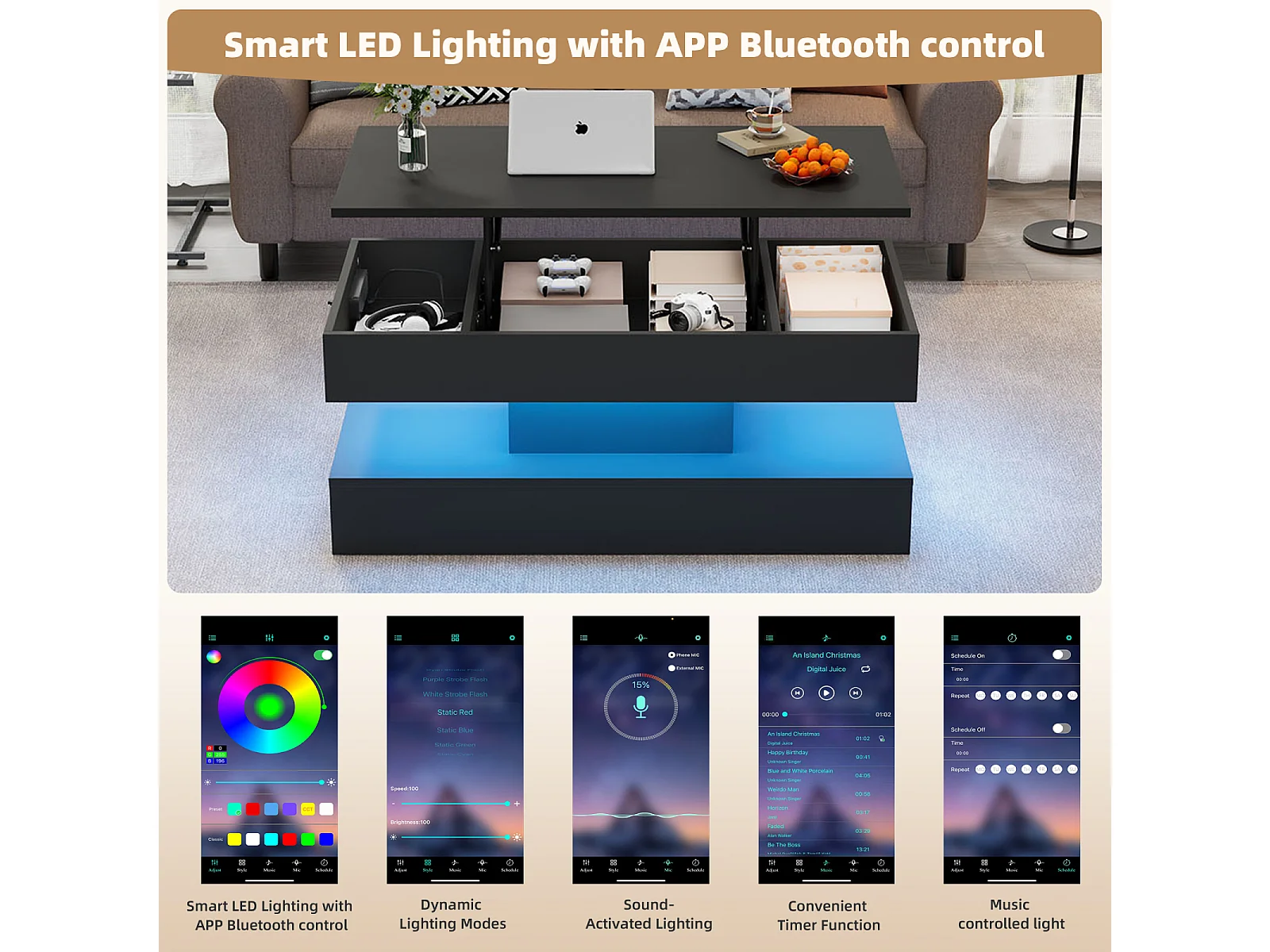 Mesa de centro moderna negra de alto brillo con iluminación LED y espacio de almacenamiento oculto