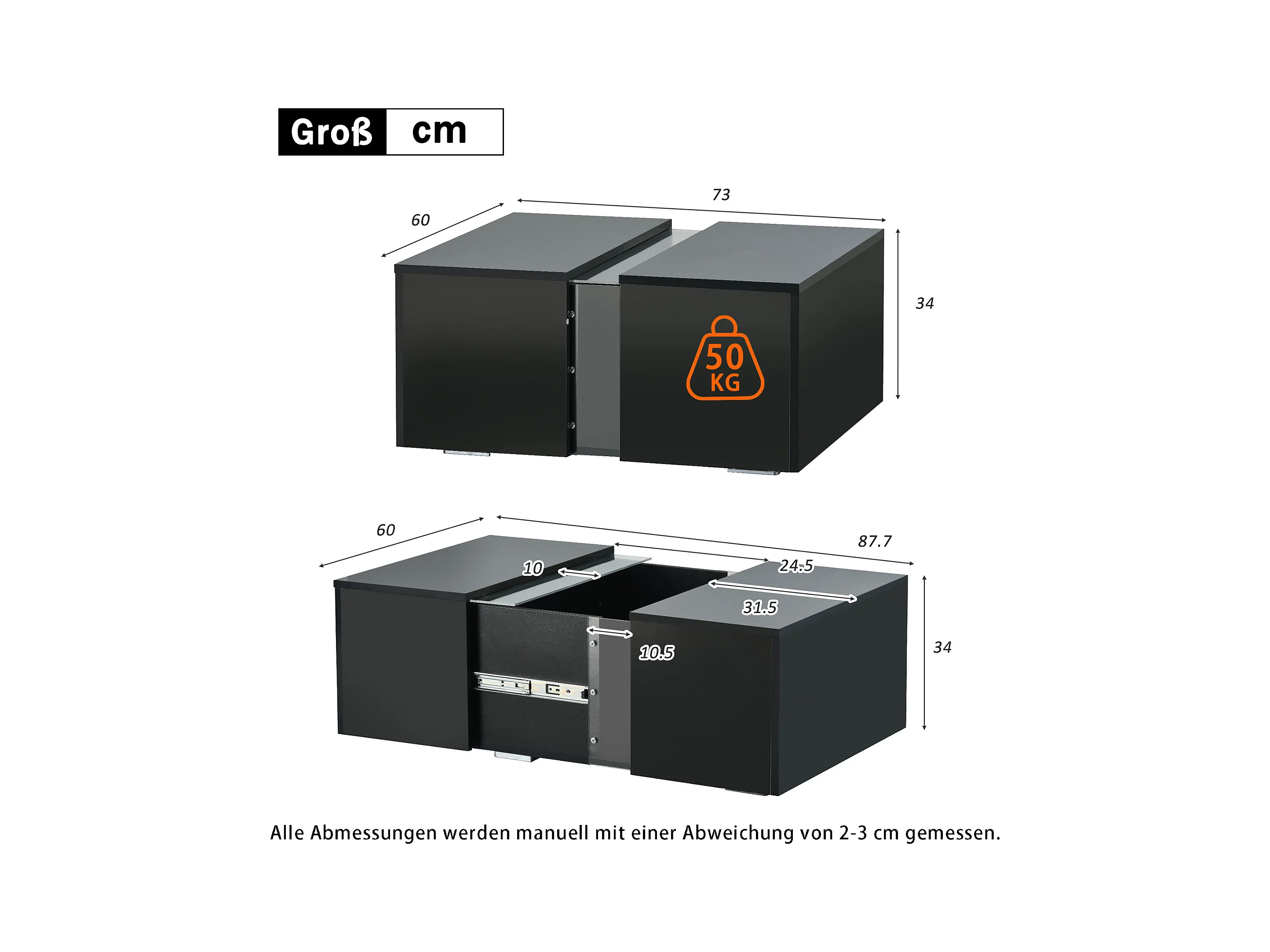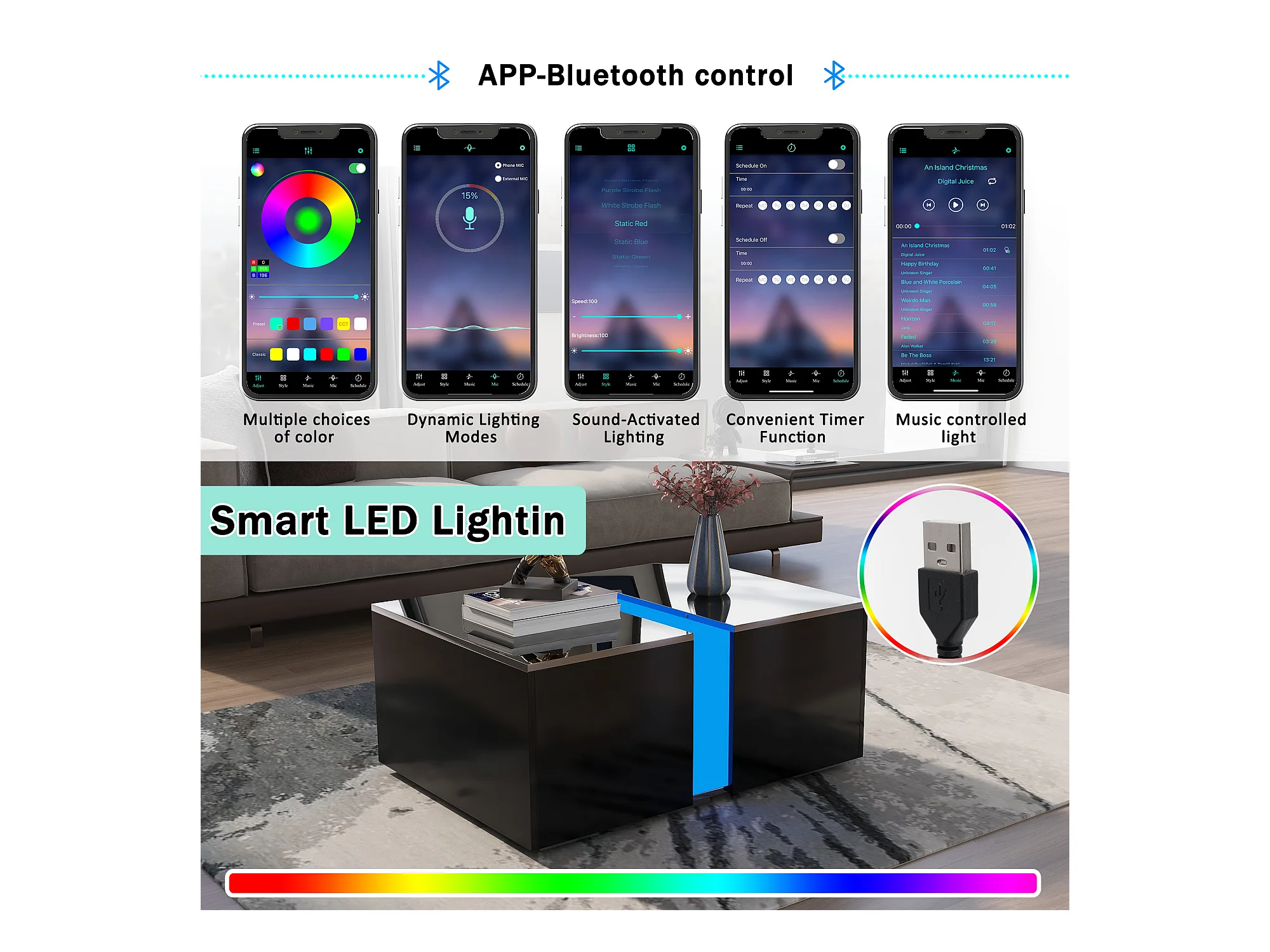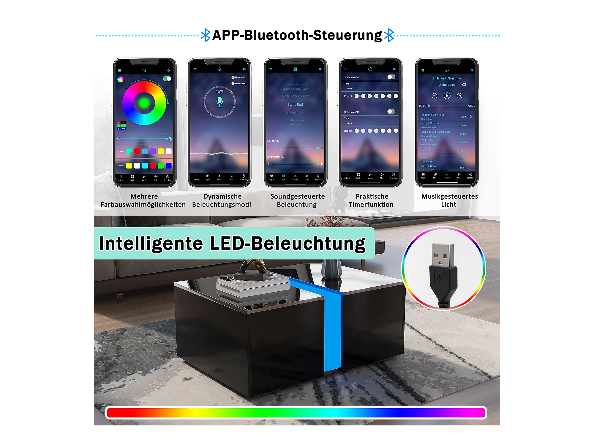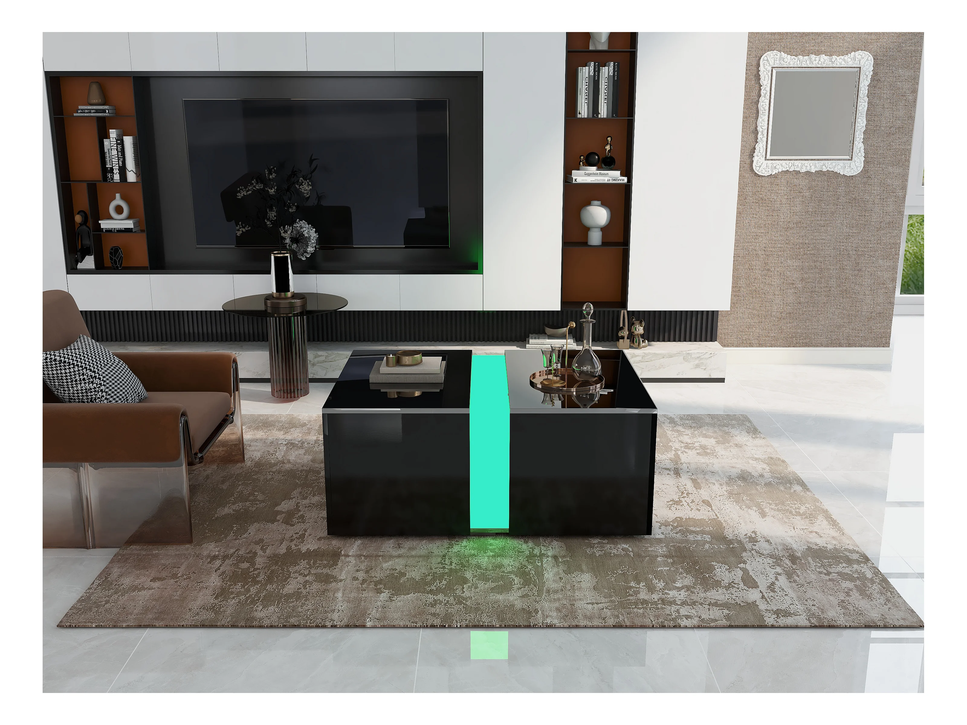 Mesa de centro moderna con LED y almacenaje oculto, aglomerado, color negro (73x60x34 cm)