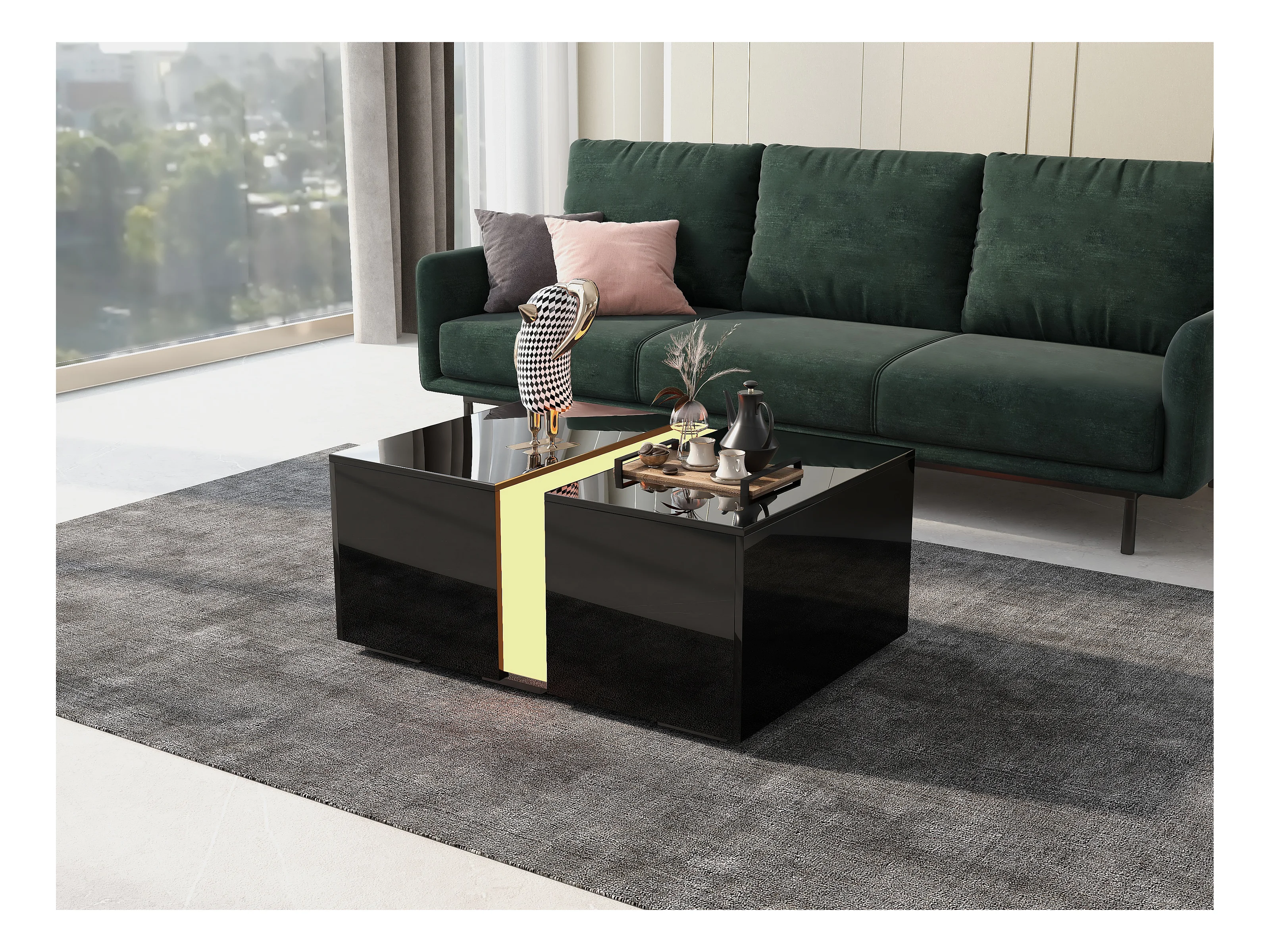 Mesa de centro moderna en acabado lacado negro brillo, 2 cajones, MDF y metal dorado (100x60x41,5 cm)