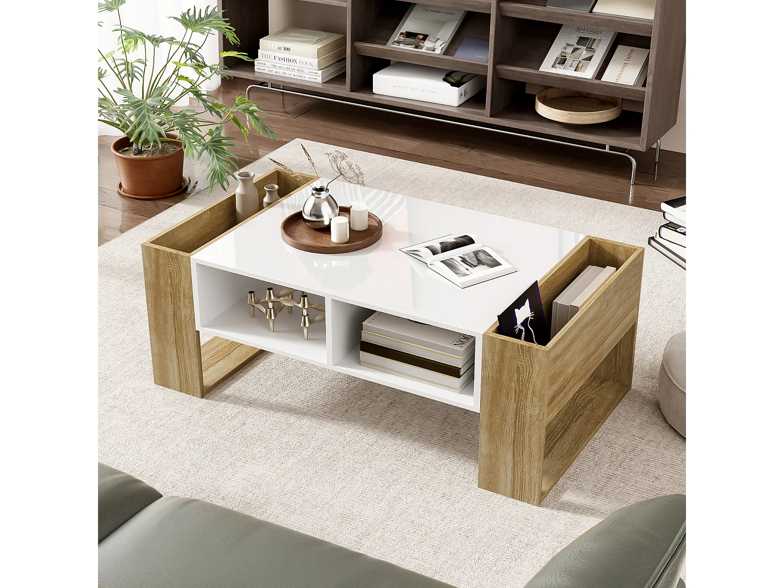 Mesa de centro moderna, parcialmente brillante, con cajones y compartimentos abiertos